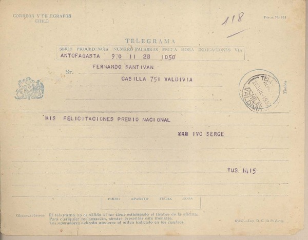 [Telegramas] [entre el 23 de junio al 7 de julio], 1952 Chile [a] Fernando Santiván [manuscrito] varios autores.