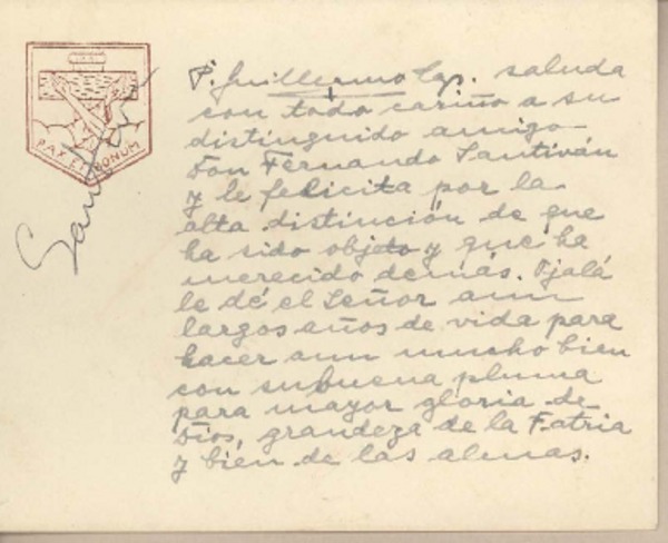 [Tarjeta] 1952 junio 28, Valdivia, Chile [a] Fernando Santiván [manuscrito] Padre Guillermo.