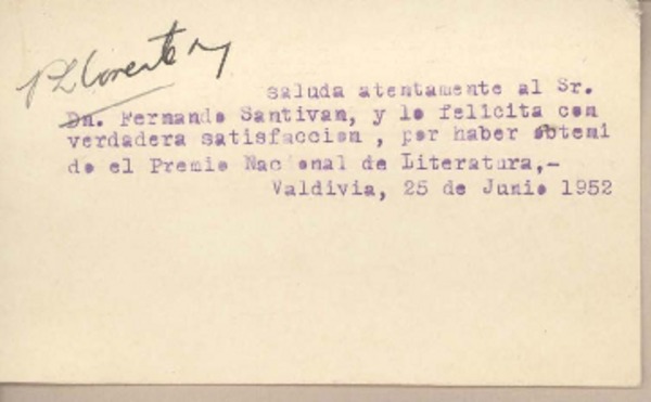 [Tarjeta] 1952 junio 25, Valdivia, Chile [a] Fernando Santiván [manuscrito] P.L.C.