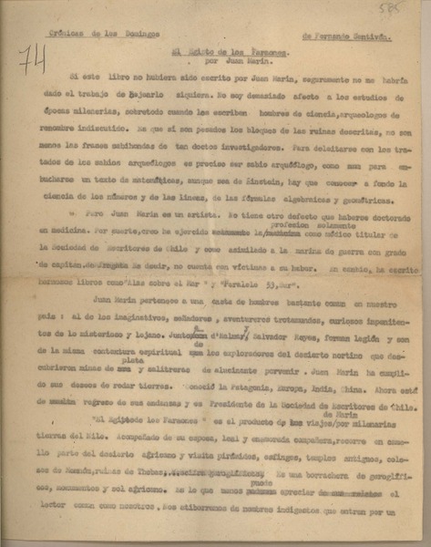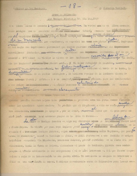 Aroma de Polinesia por Enrique Bunster [manuscrito] Fernando Santiván.