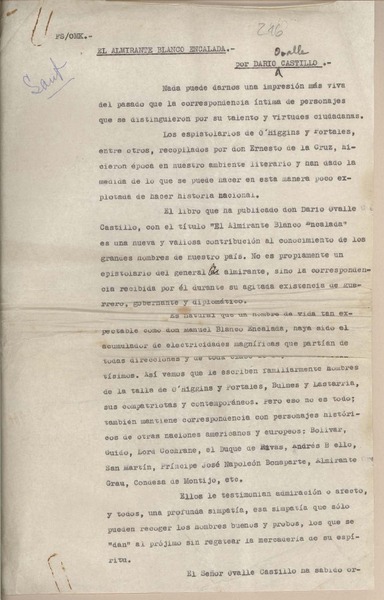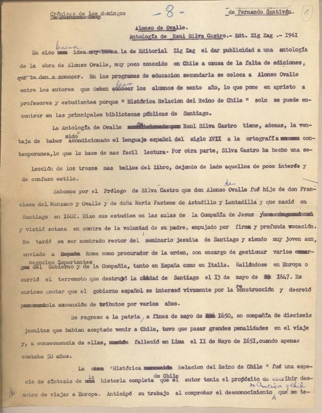 Alonso de Ovalle. Antologia de Raúl Silva Castro [manuscrito] Fernando Santiván.