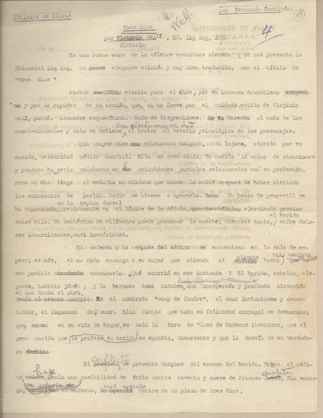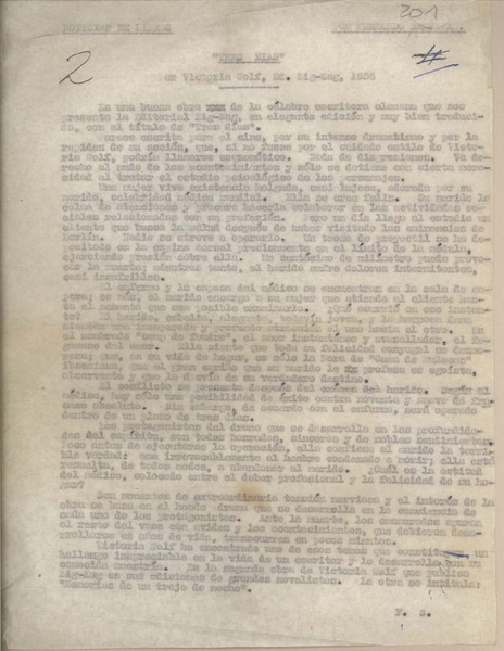Tres días por Victoria Wolf [manuscrito] Fernando Santiván.