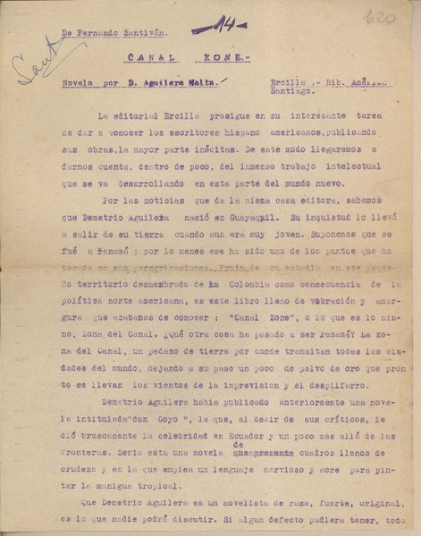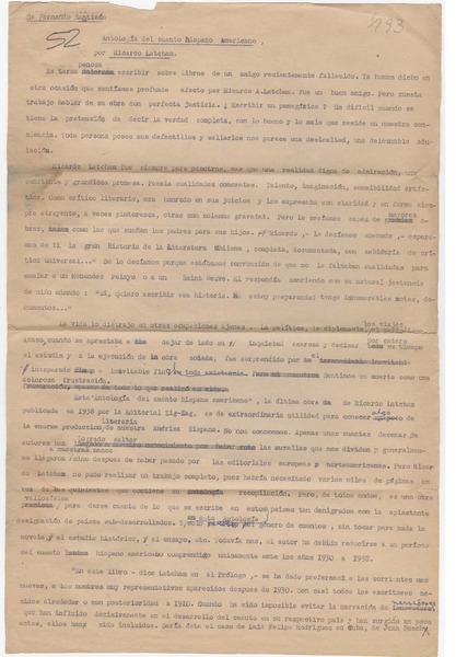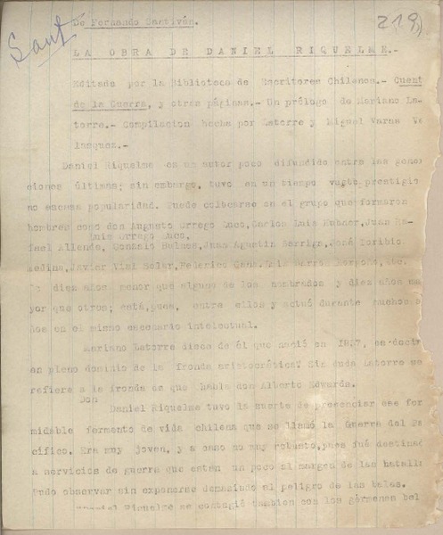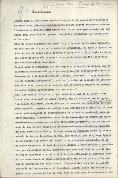 Antología del cuento hispanoamericano por R. Latcham [manuscrito] Fernando Santiván.