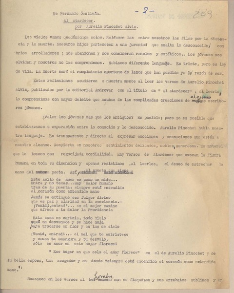 Del atardecer - Manuscritos chilenos - Reseñas de libros - Pinochet Alvis, Aurelio