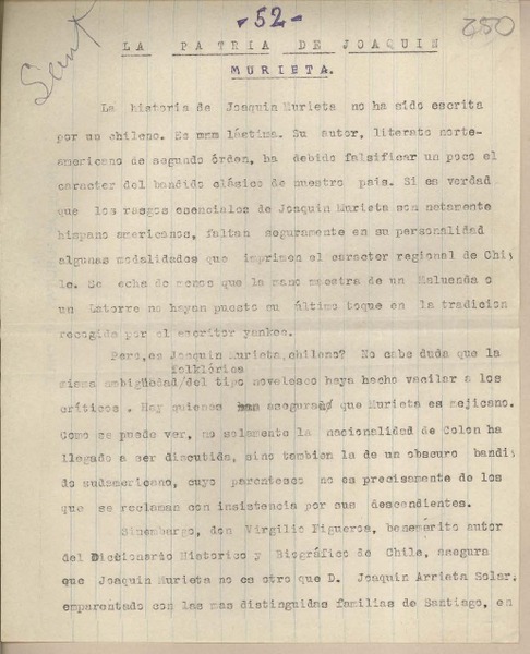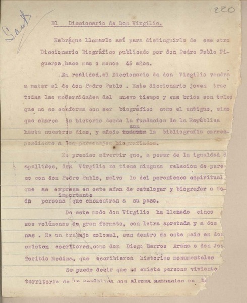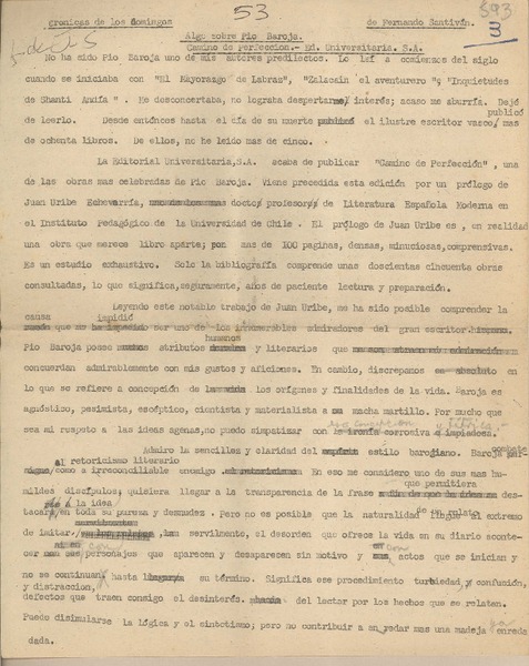 Algo sobre Pío Baroja [manuscrito] Fernando Santiván.
