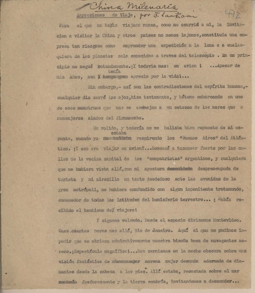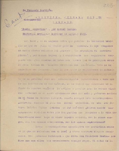 Argentina juzgada por un peruano [manuscrito] Fernando Santiván.