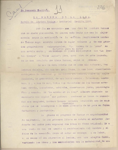 Señores de la tierra por Elías Arze [manuscrito] Fernando Santiván.