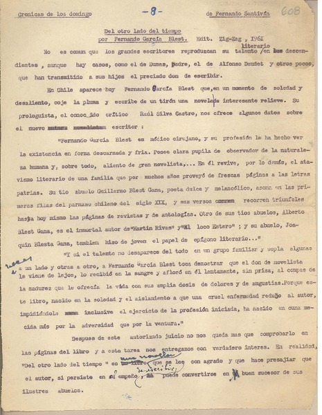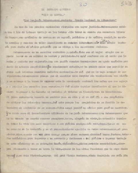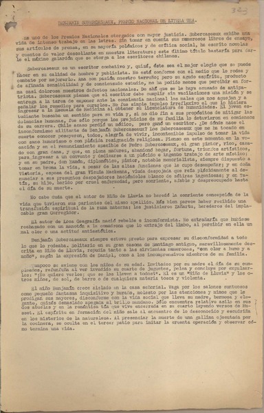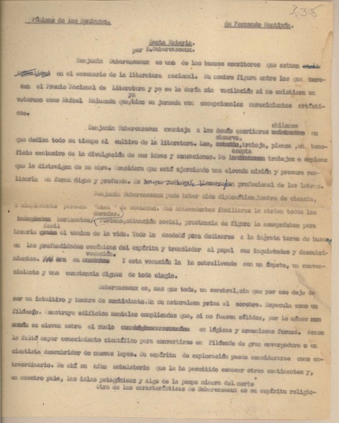 Benjamín Subercaseaux [manuscrito] Fernando Santiván.
