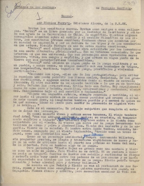 Terral por Nicolás Ferraro [manuscrito] Fernando Santiván.