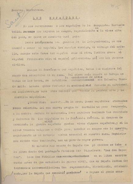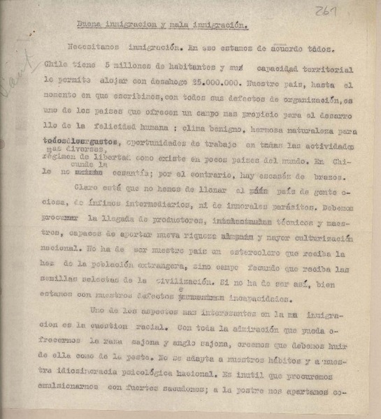 Buena inmigración y mala inmigración [manuscrito] Fernando Santiván.