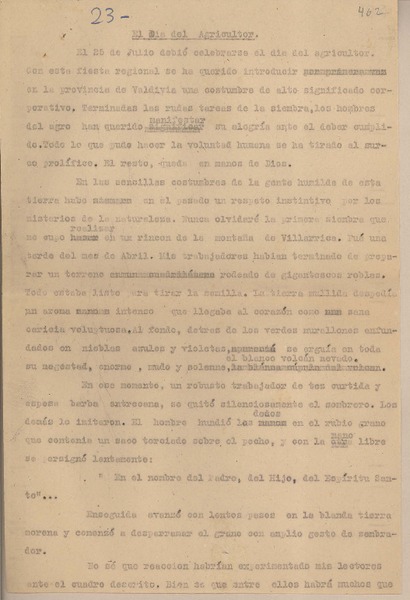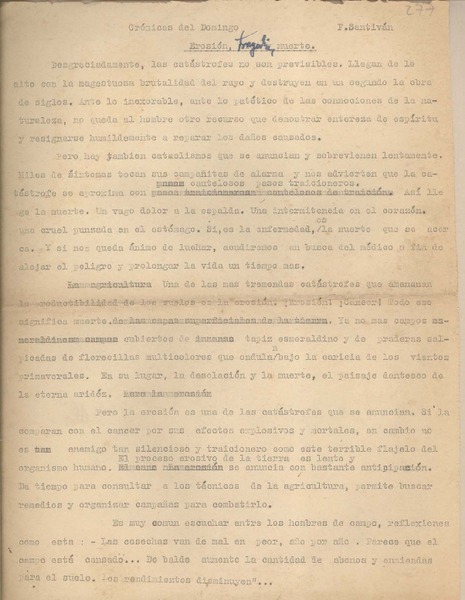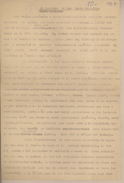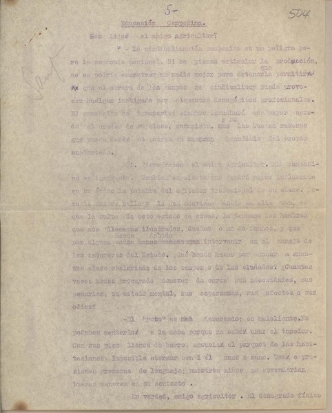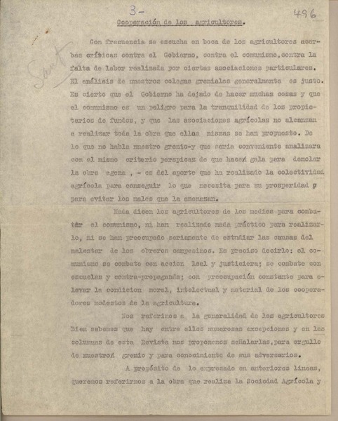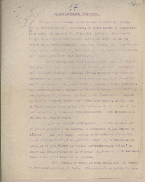 Sindicalización campesina [manuscrito] Fernando Santiván.