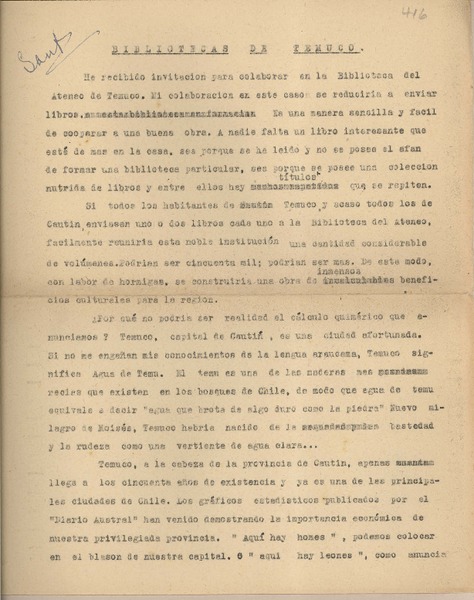 Bibliotecas de Temuco [manuscrito] Fernando Santiván.
