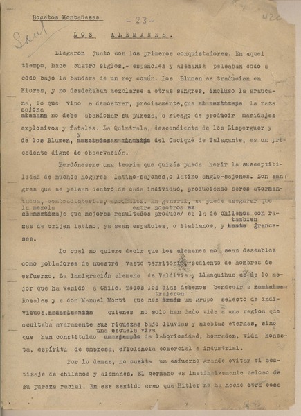 Andanzas de un alemán en Chile [manuscrito] Fernando Santiván.