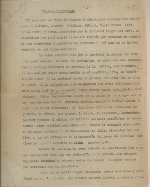 Tópicos literarios [manuscrito] Fernando Santiván.