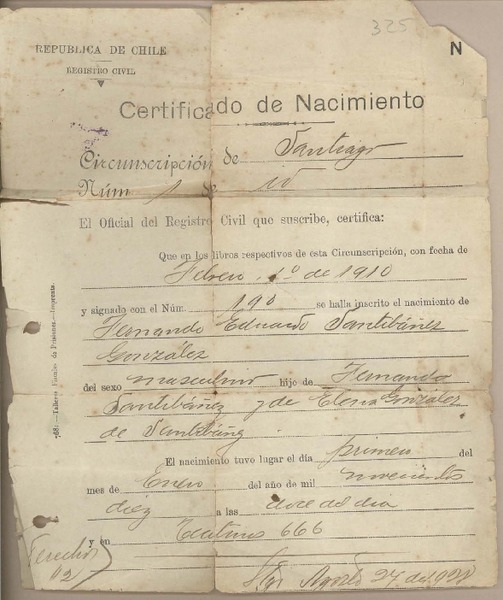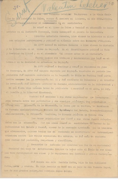 Valentín Letelier [manuscrito] Fernando Santiván.