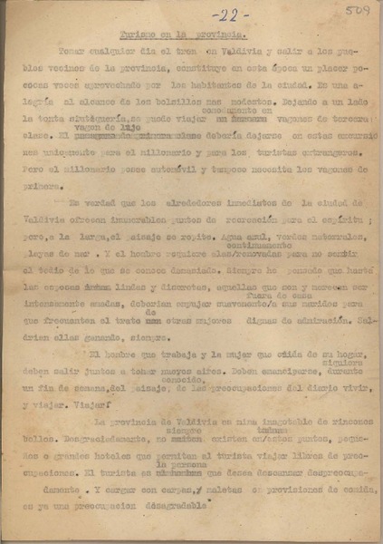 Turismo en la provincia [manuscrito] Fernando Santiván.