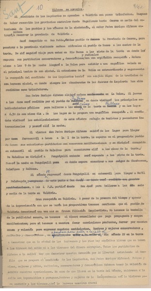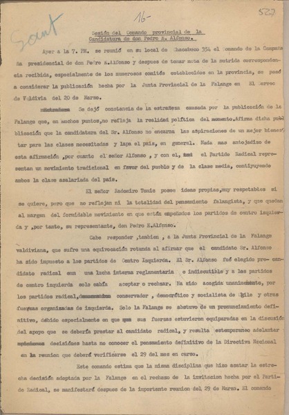 Sesión del comando provincial de la candidatura de don Pedro E. Alfonso [manuscrito] Fernando Santiván.