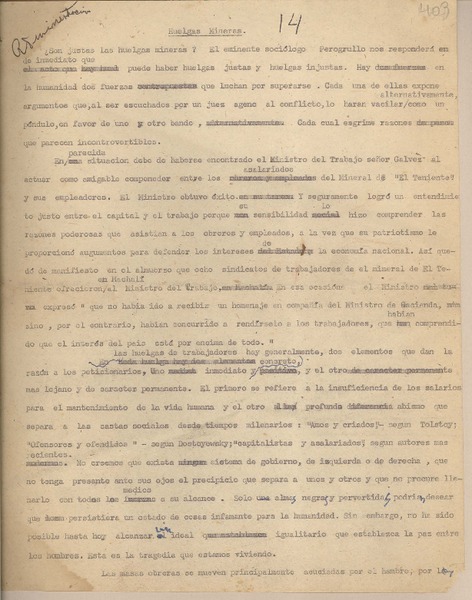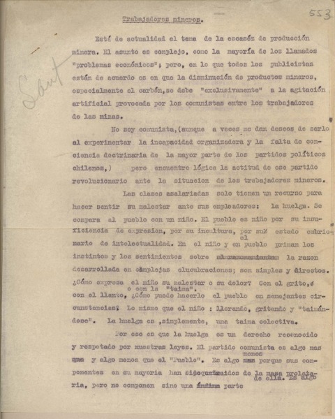 Trabajadores mineros [manuscrito] Fernando Santiván.