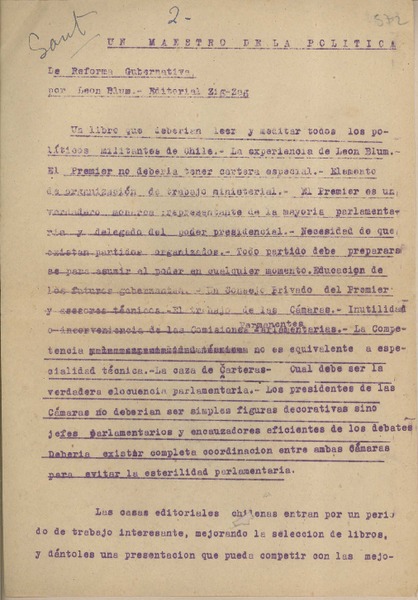 Manuscritos chilenos - Reforma gubernativa - Blum, León - Reseñas de libros