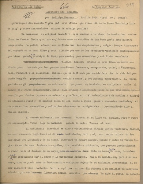 Arranques del corazón - Manuscritos chilenos - Reseñas de libros - Marceau, Félicien