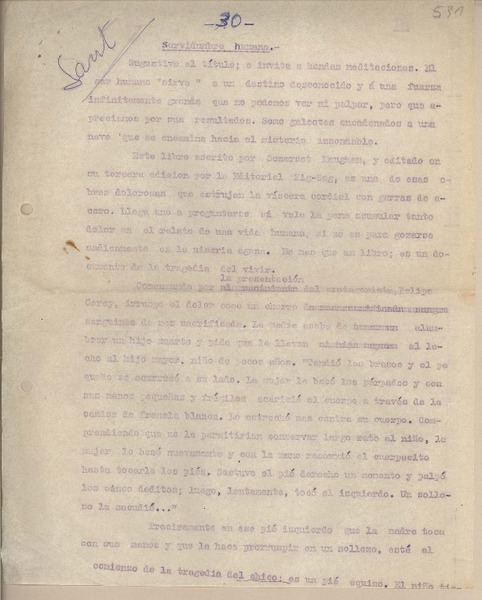 Servidumbre humana [manuscrito] Fernando Santiván.