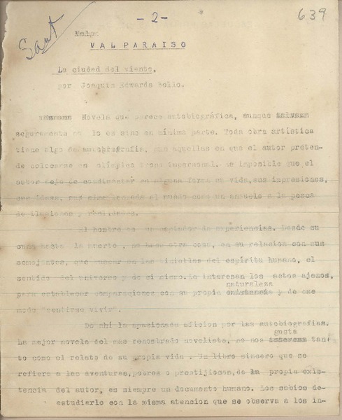 Ciudad del viento - Manuscritos chilenos - Reseñas de libros - Edwards Bello, Joaquín