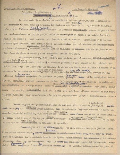 Solicitud de préstamos a Estados Unidos [manuscrito] Fernando Santiván.