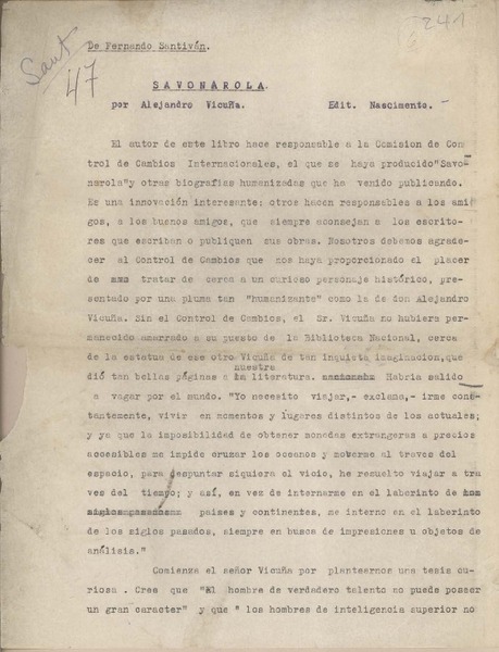 Savonarola por Alejandro Vicuña [manuscrito] Fernando Santiván.