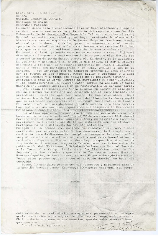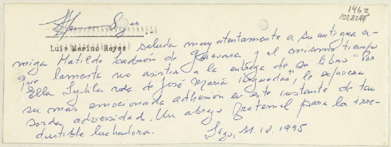 [Tarjeta] 1995 abril 11, Santiago, Chile [a] Matilde Ladrón de Guevara [manuscrito] Luis Merino Reyes.