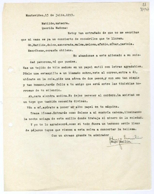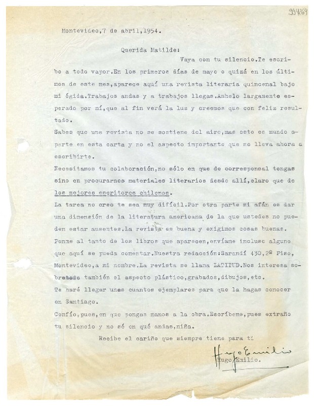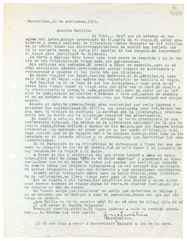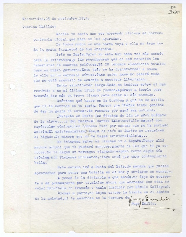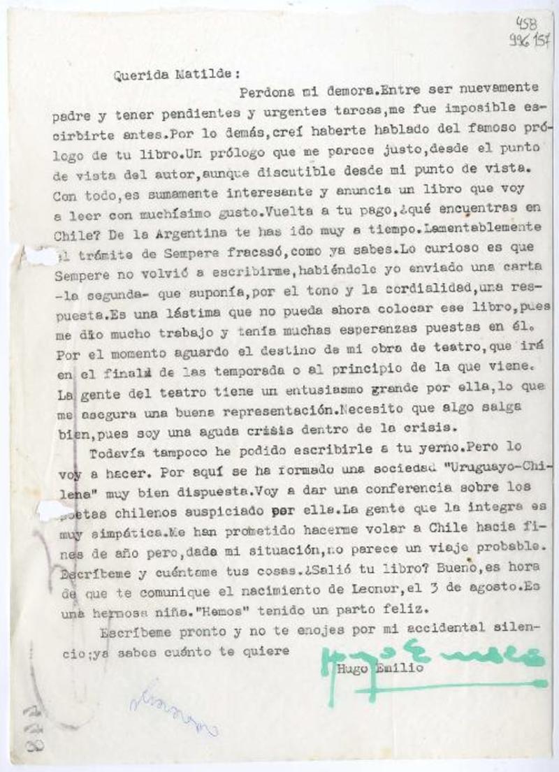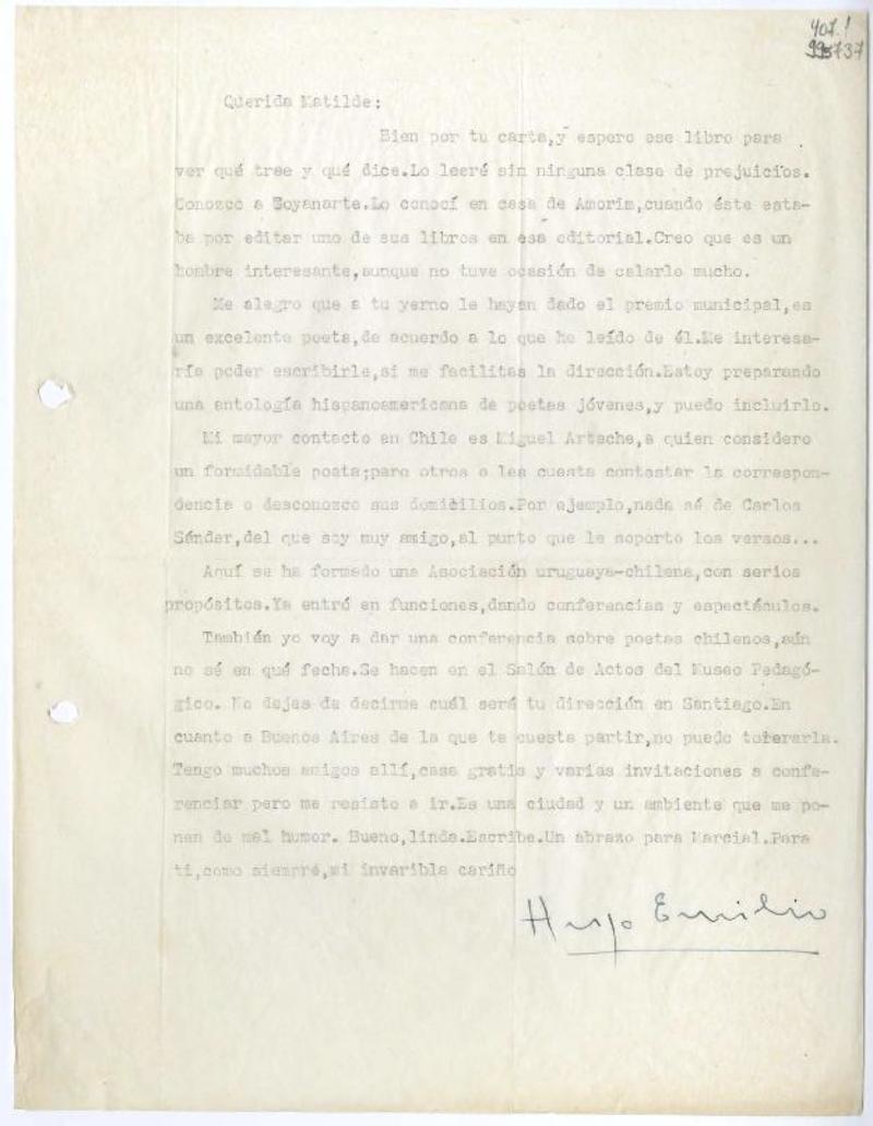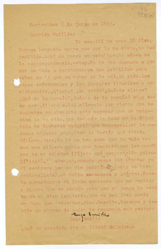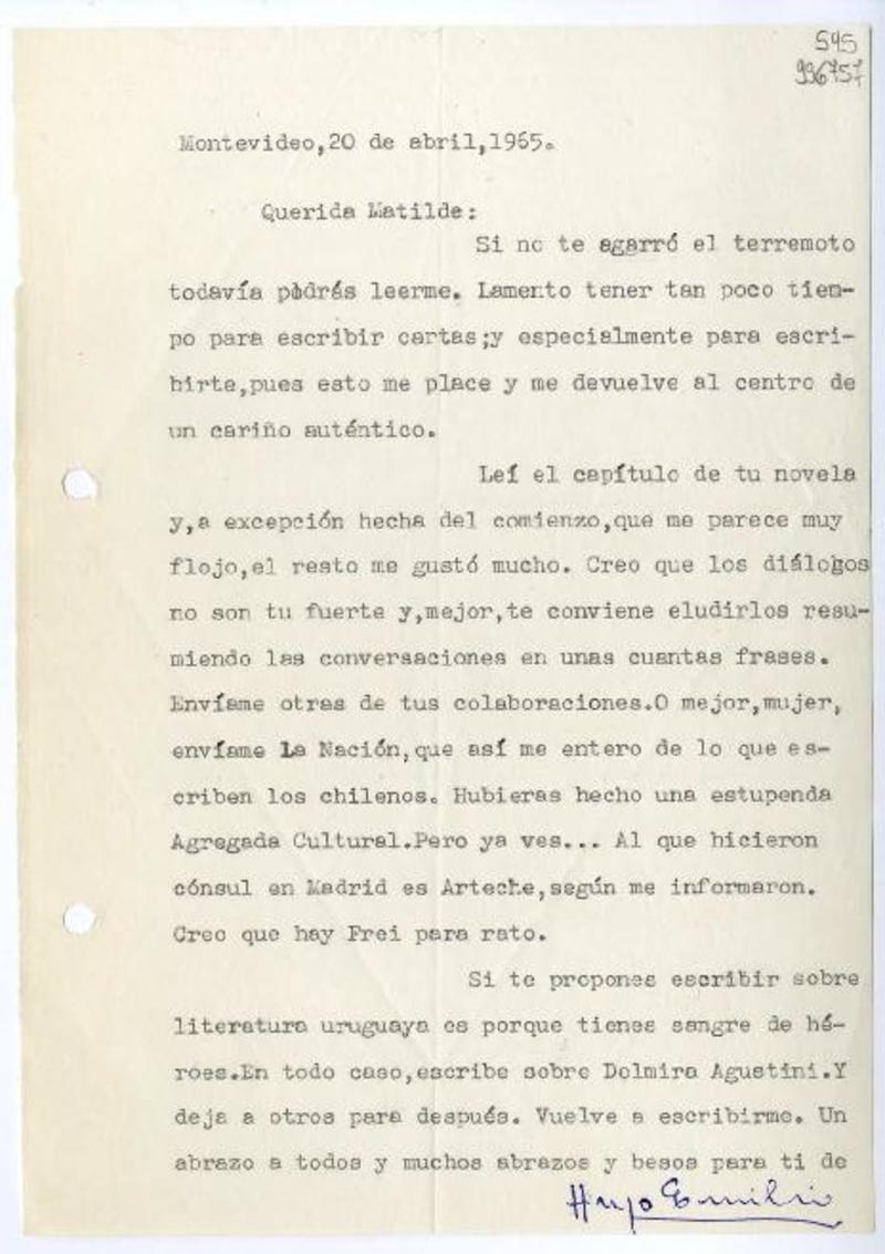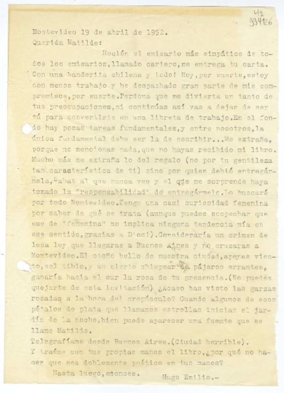 [Carta] 1952 abril 19, Montevideo, [Uruguay] [a] Querida Matilde [manuscrito] Hugo Emilio.