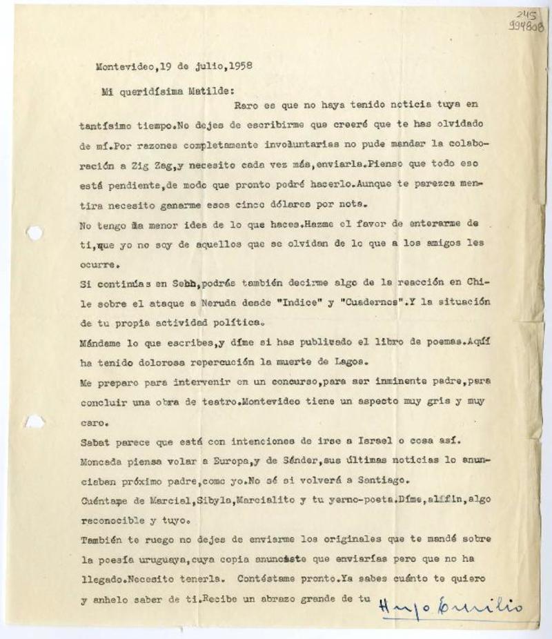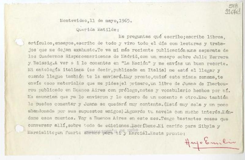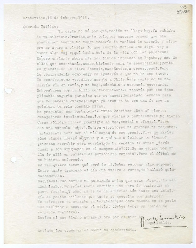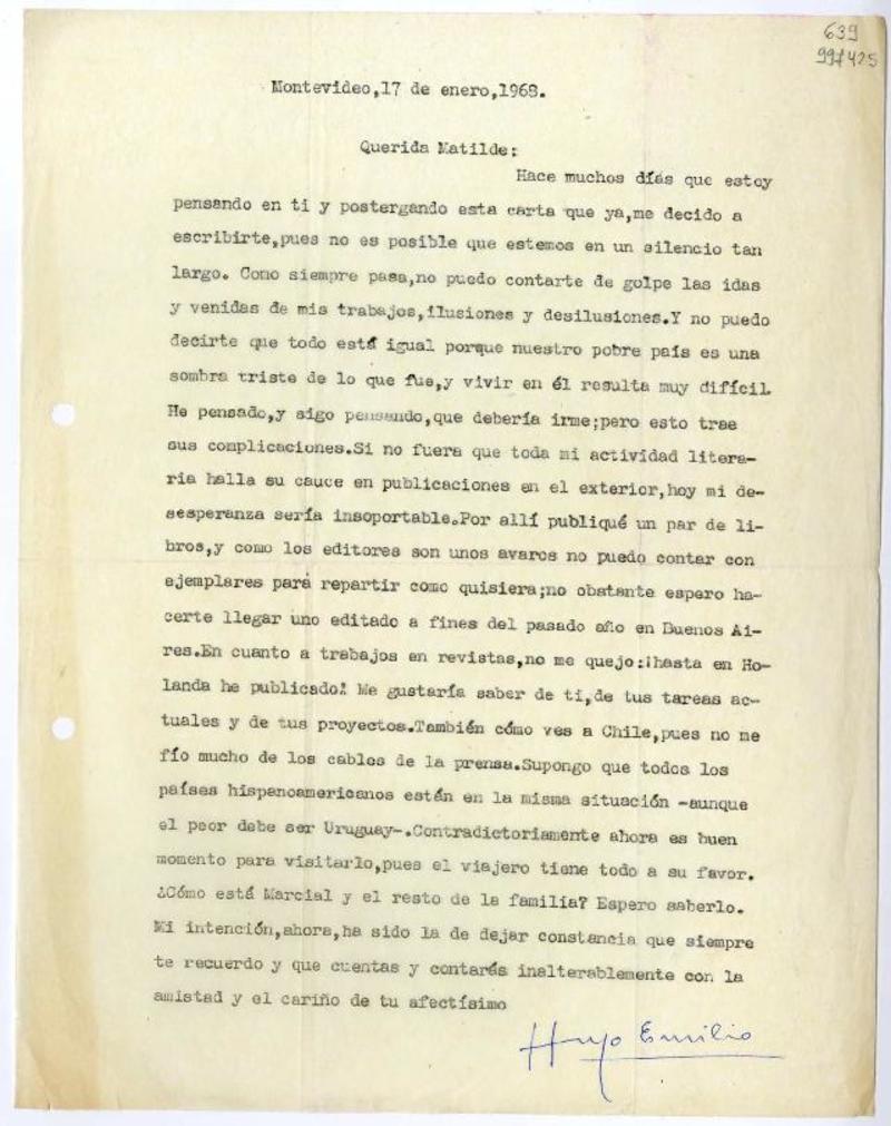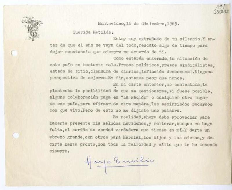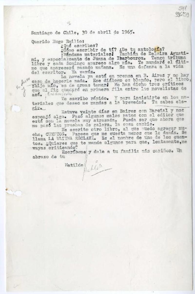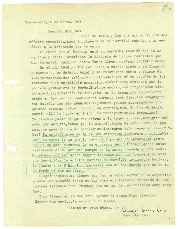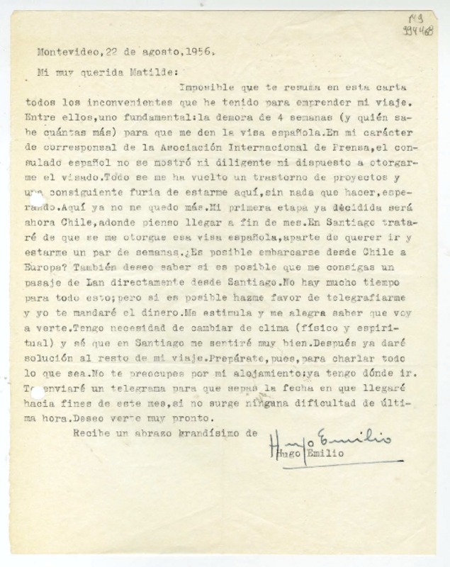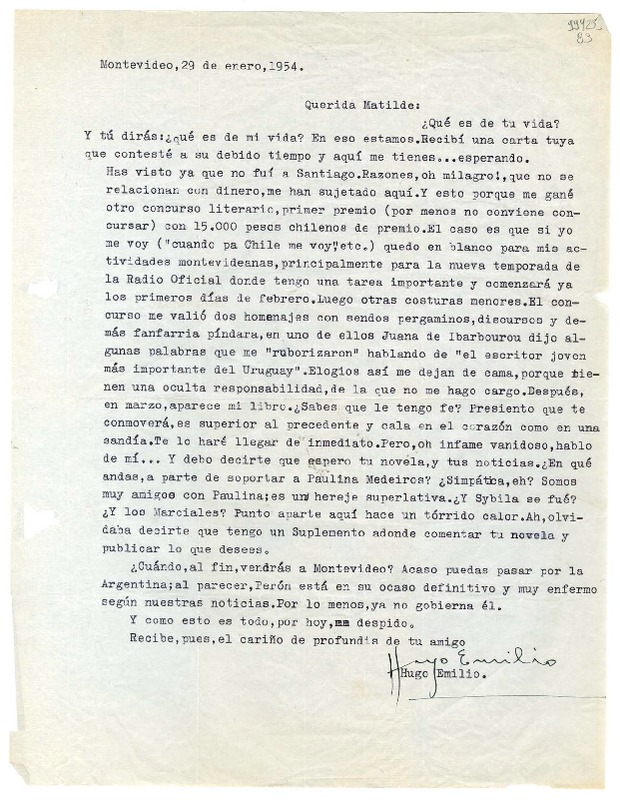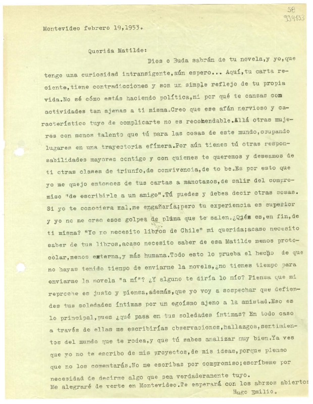 [Carta] 1952 abril 19, Montevideo, [Uruguay] [a] Querida Matilde [manuscrito] Hugo Emilio.