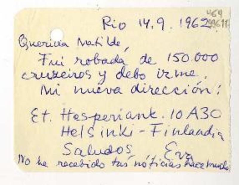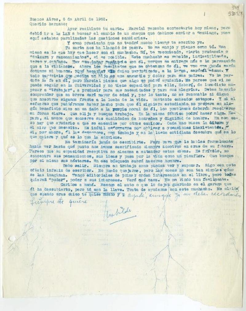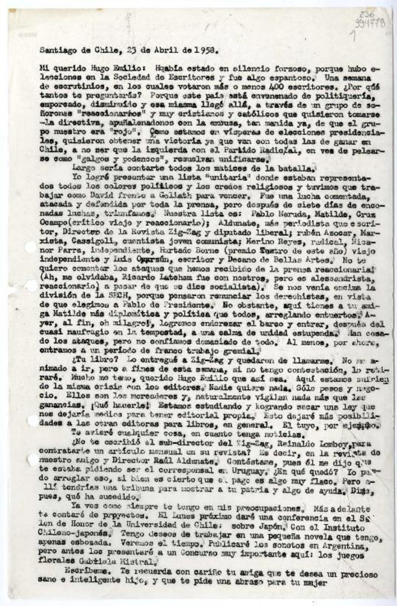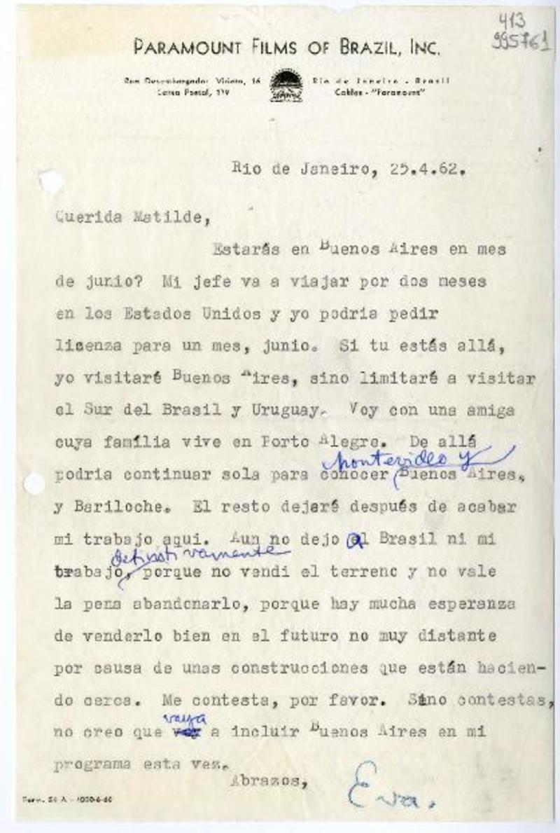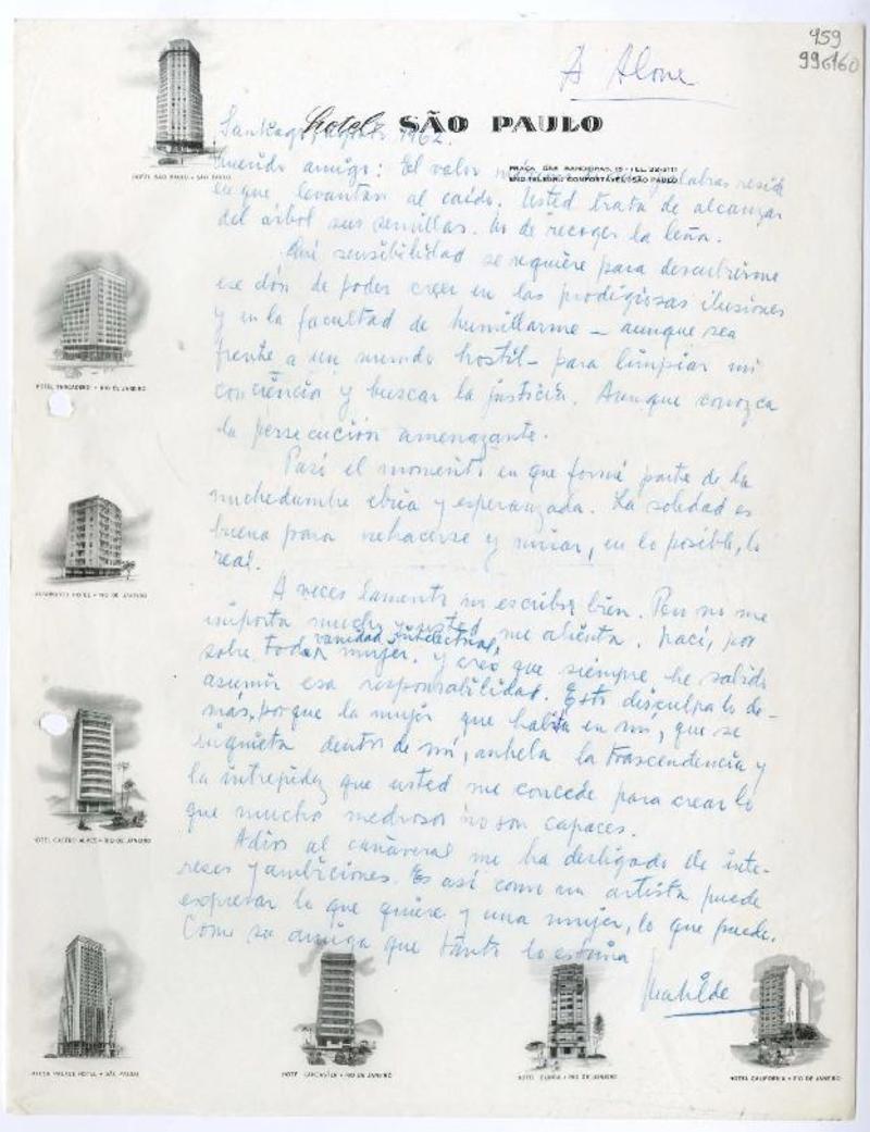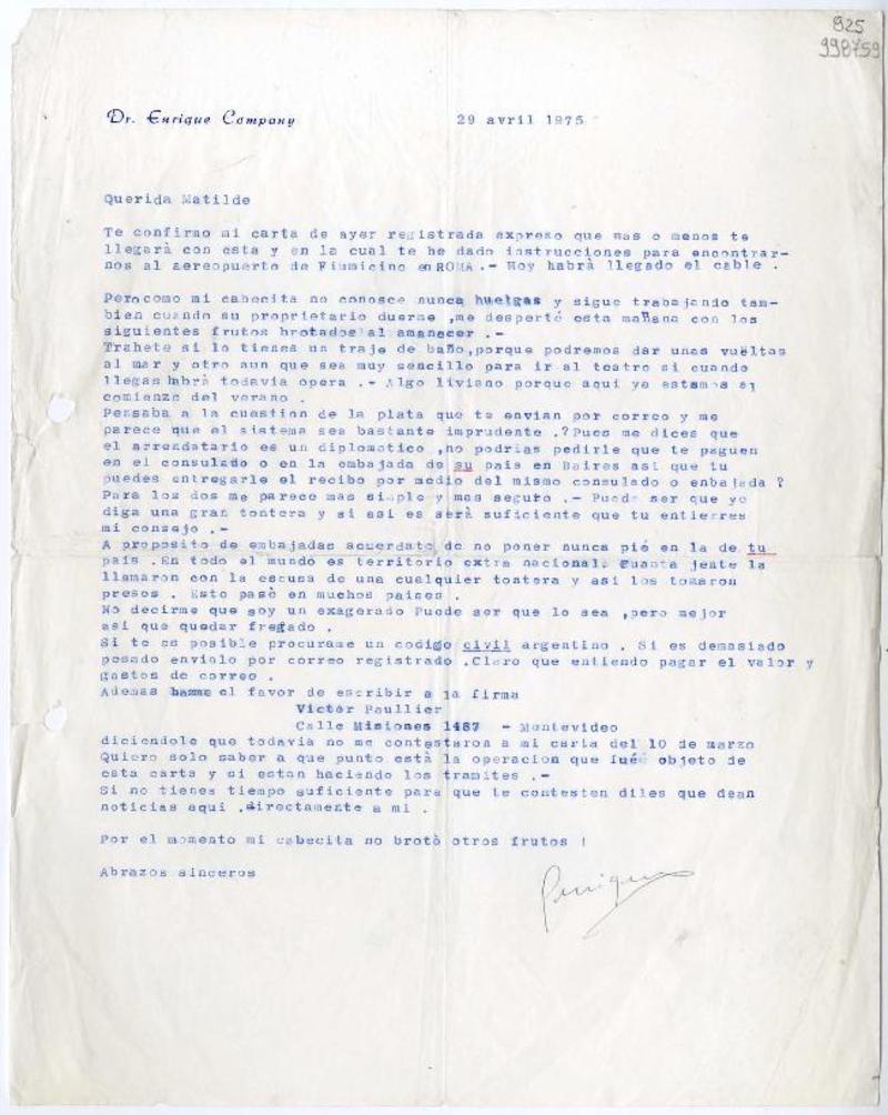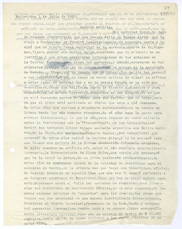 [Carta] 1952 abril 19, Montevideo, [Uruguay] [a] Querida Matilde [manuscrito] Hugo Emilio.