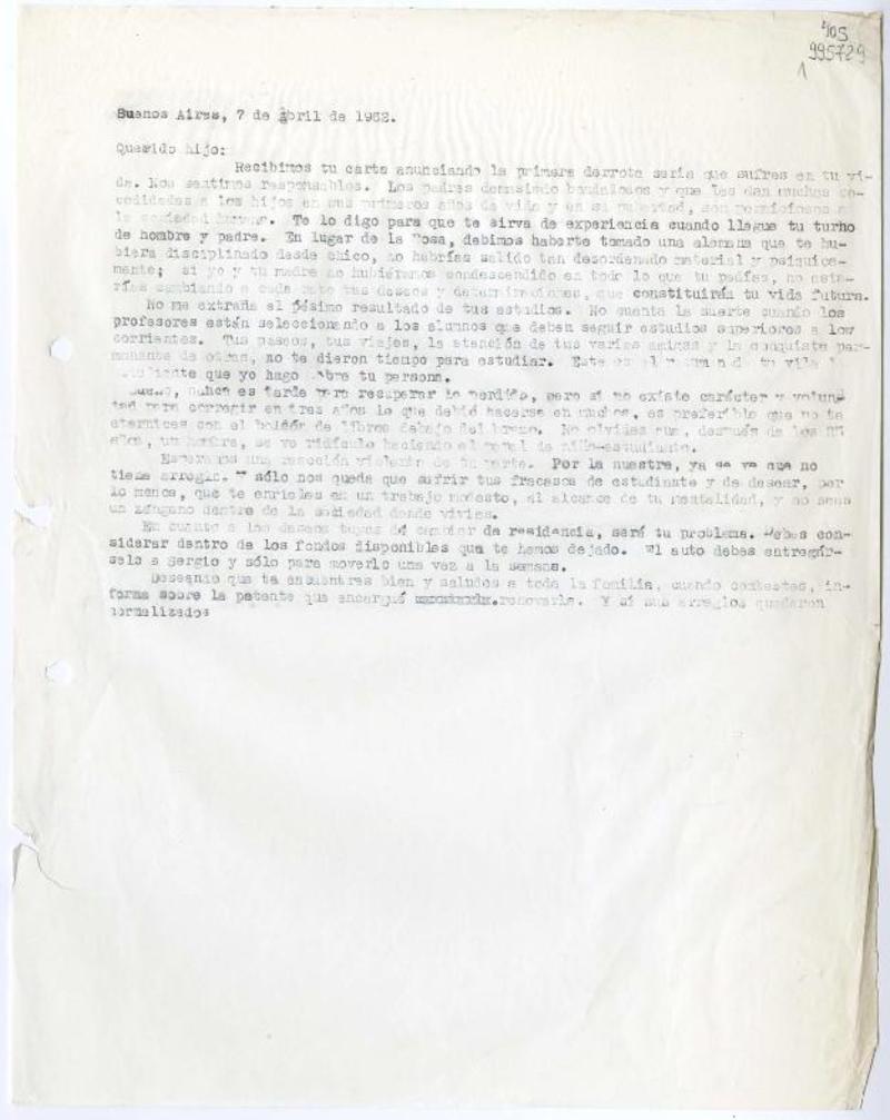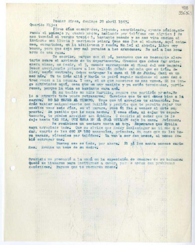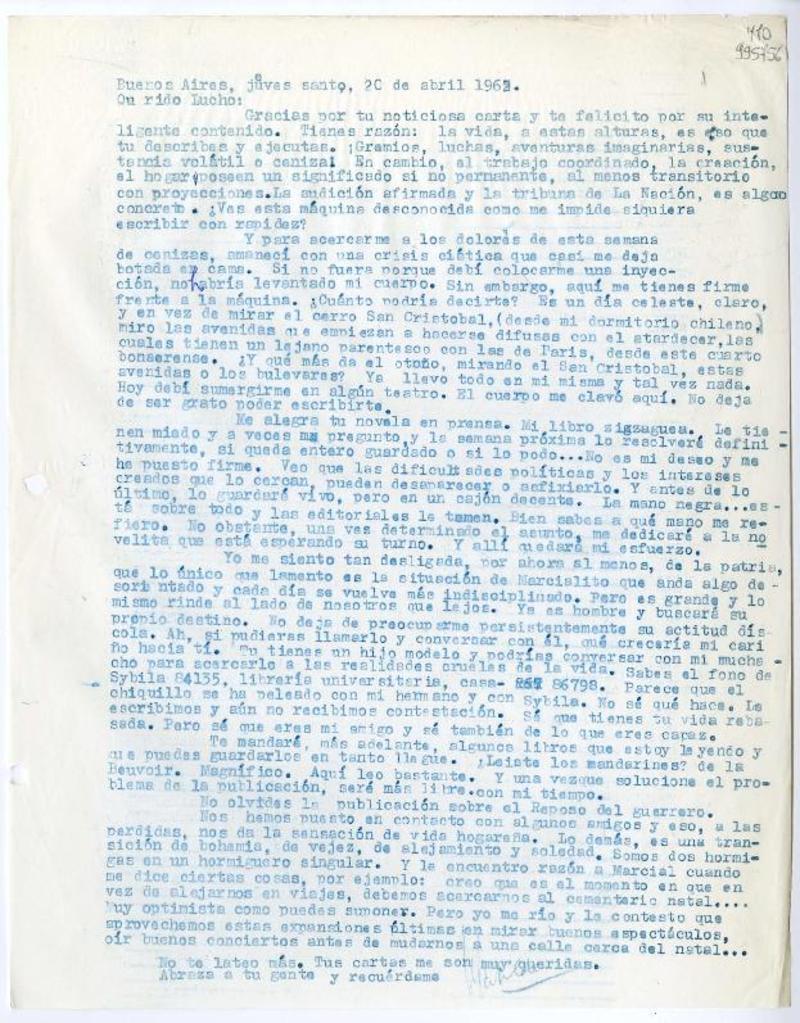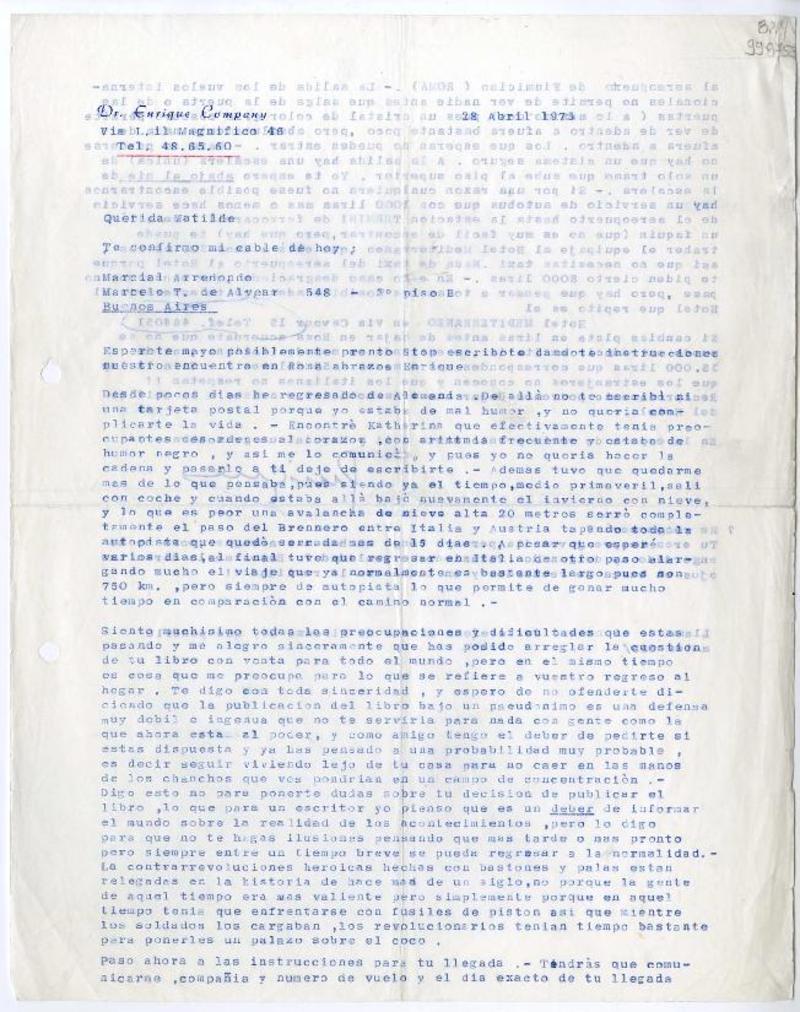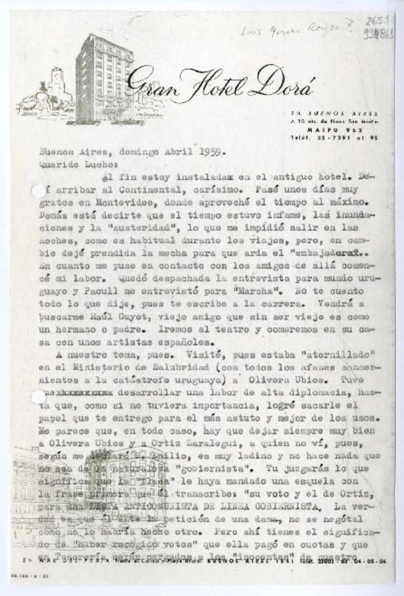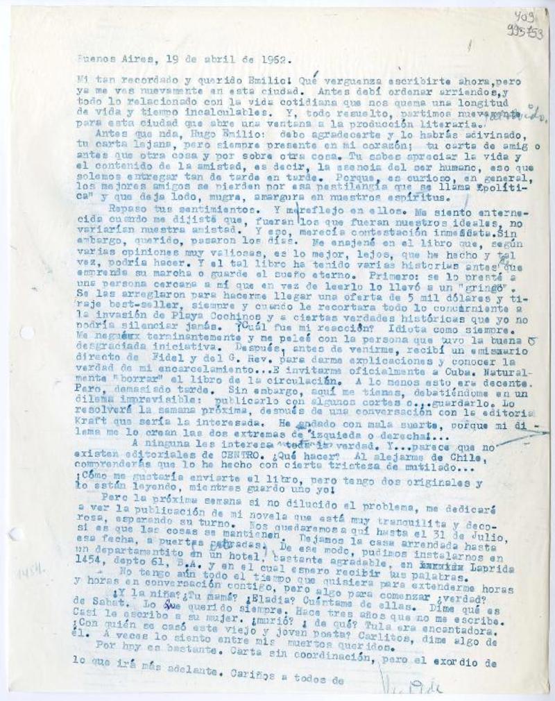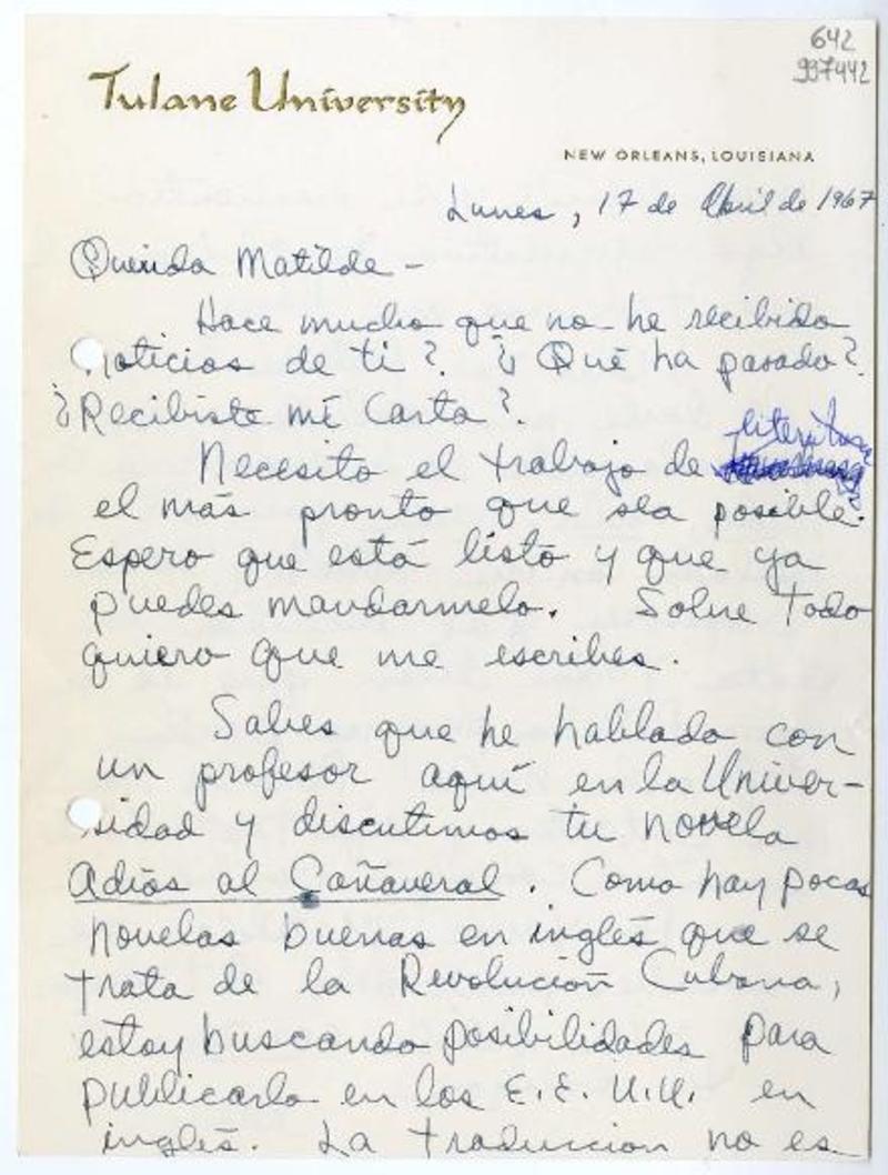 [Carta] 1952 abril 19, Montevideo, [Uruguay] [a] Querida Matilde [manuscrito] Hugo Emilio.