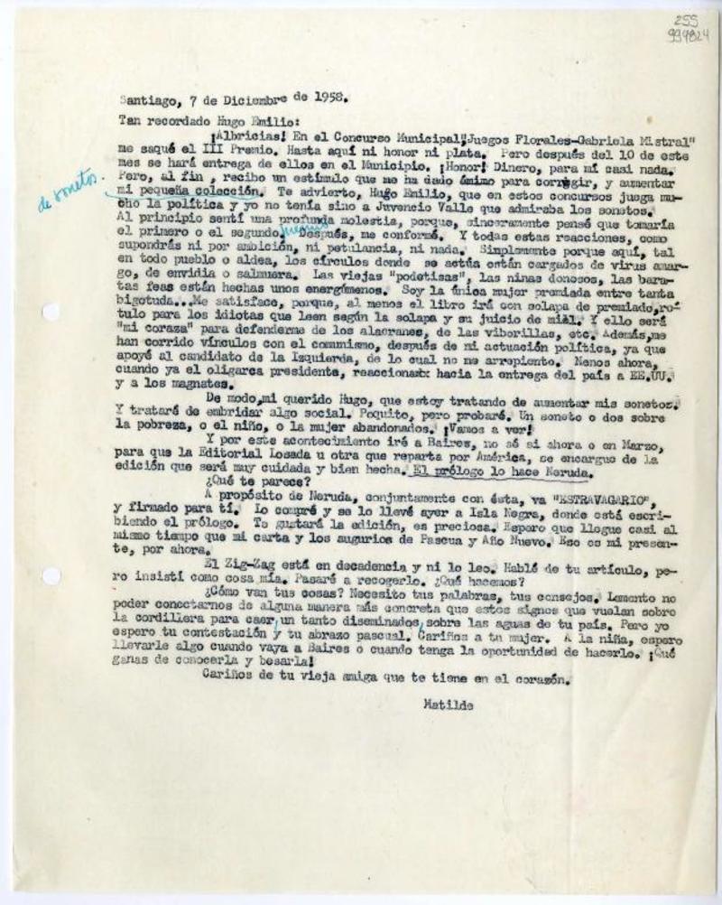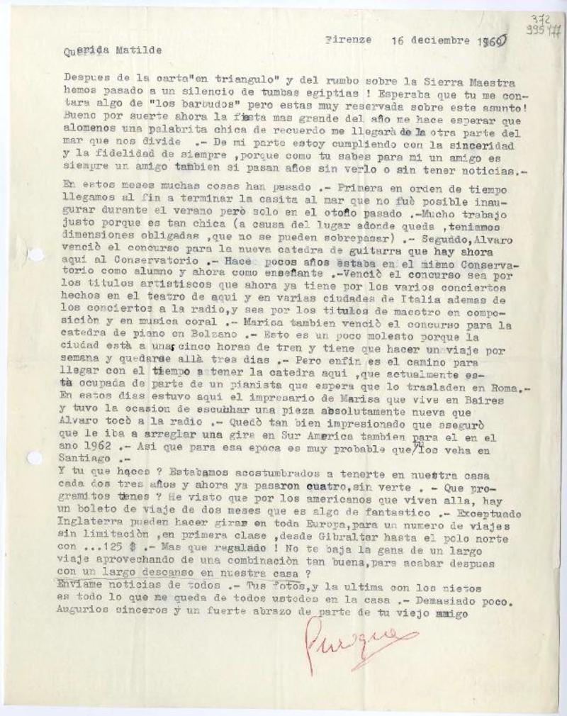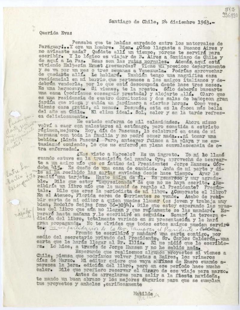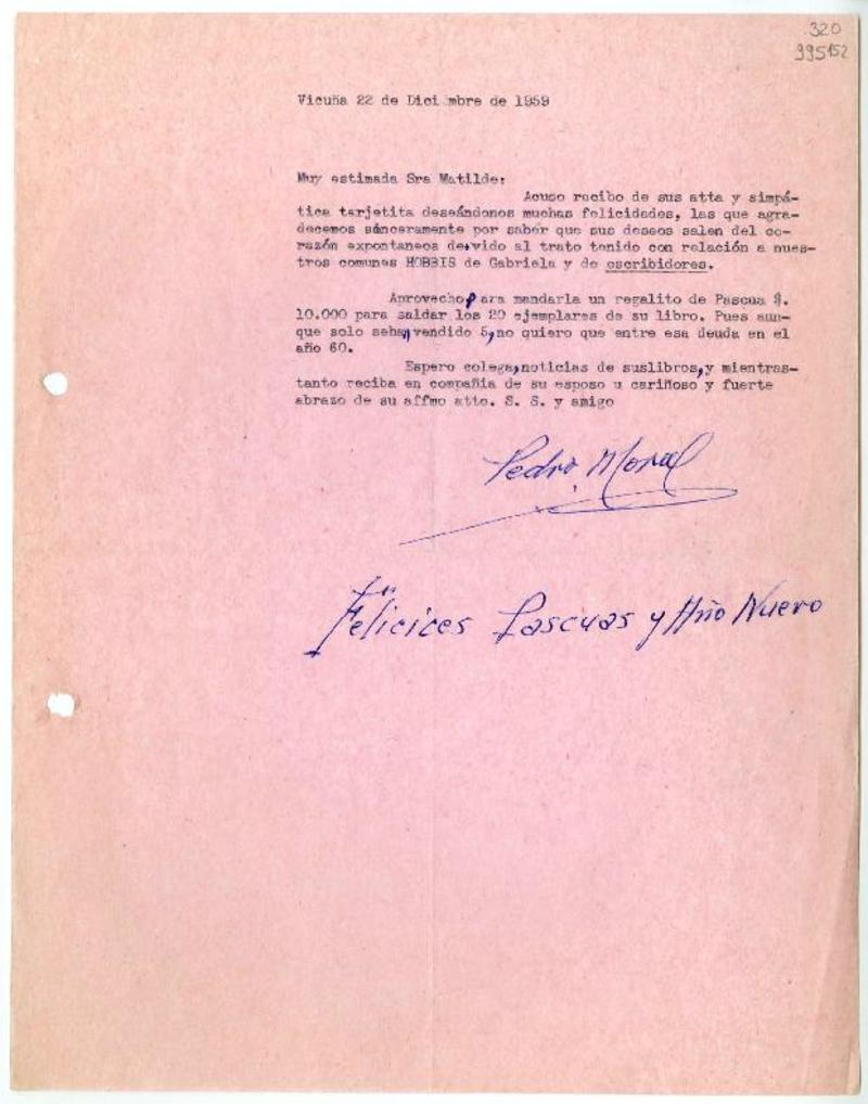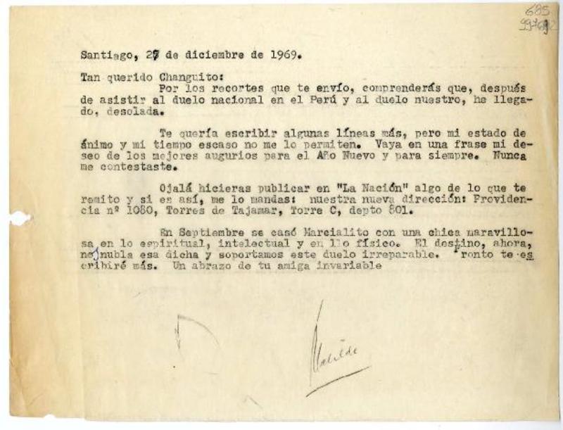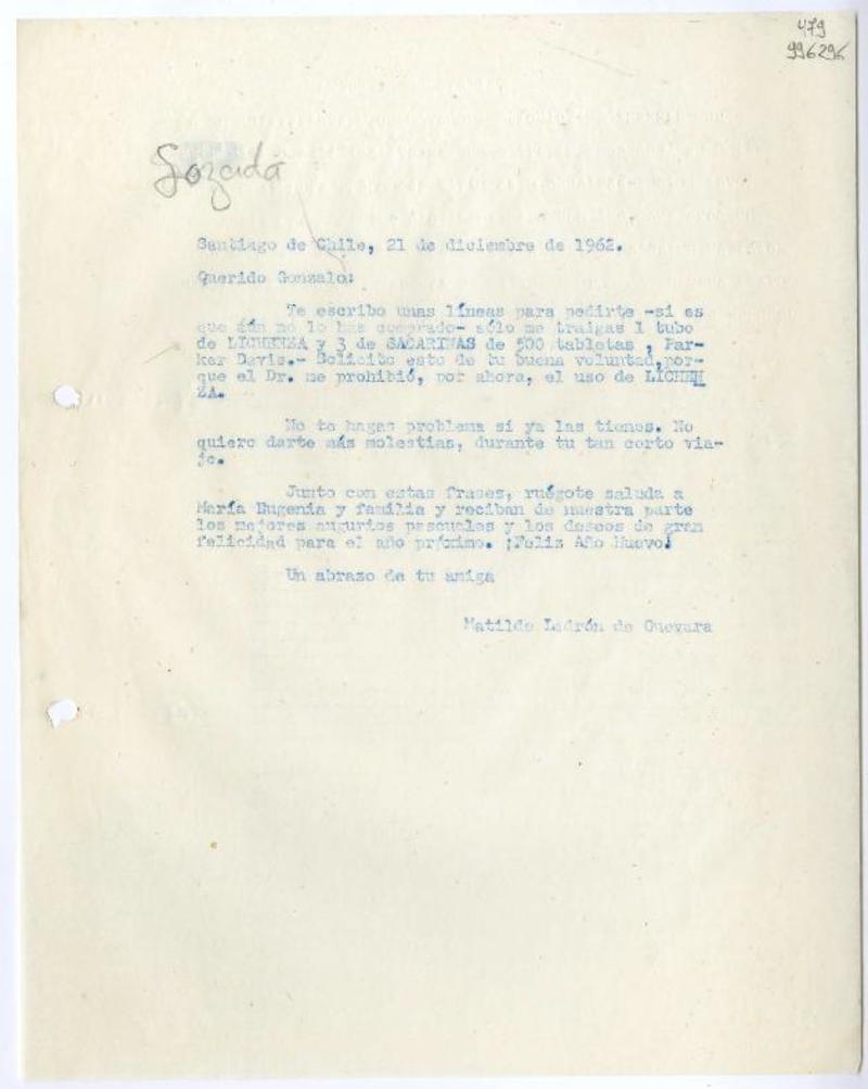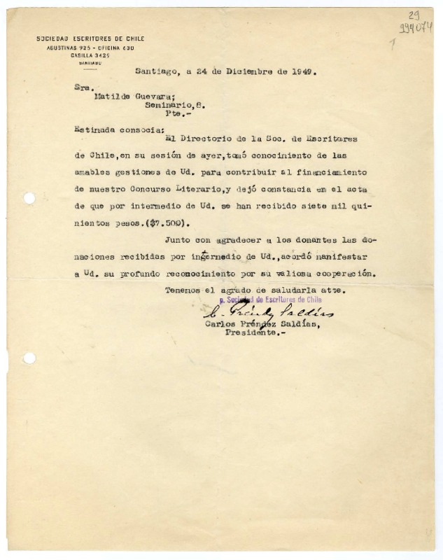 [Carta] 1949 diciembre 24, Santiago, [Chile] [a] Matilde Ladrón de Guevara [manuscrito] Carlos Préndez Saldías.