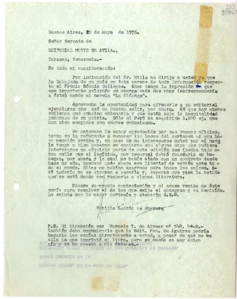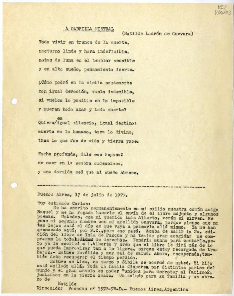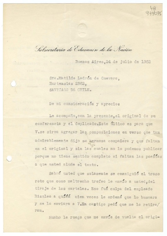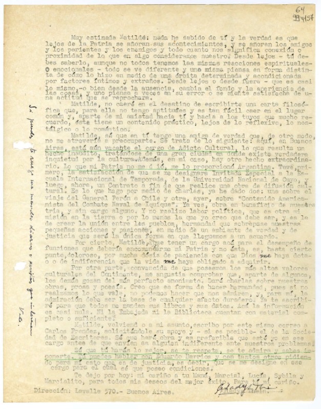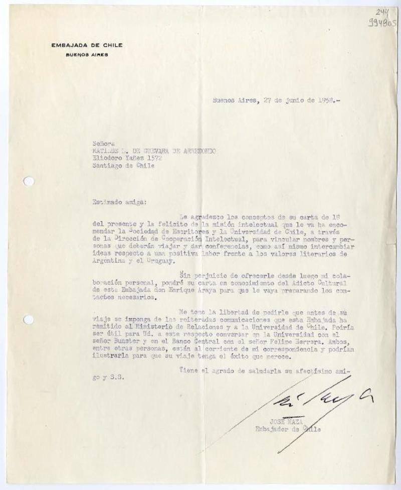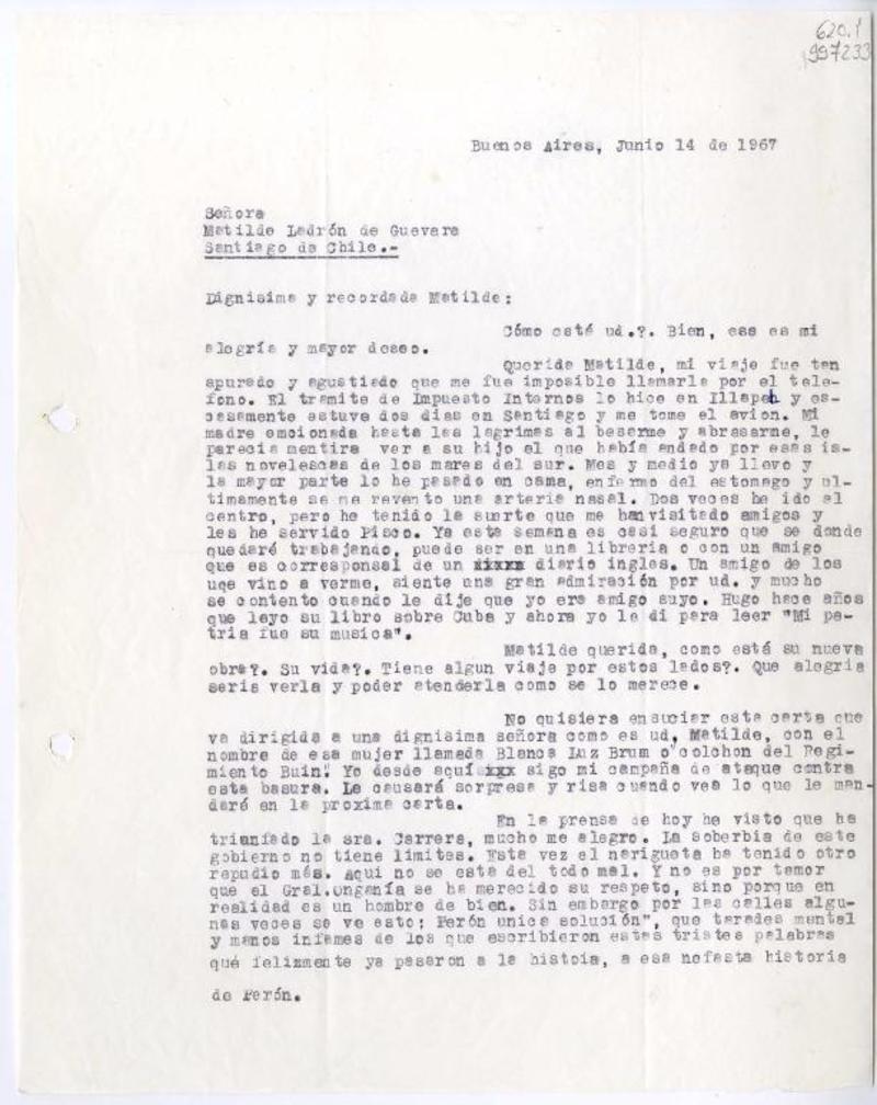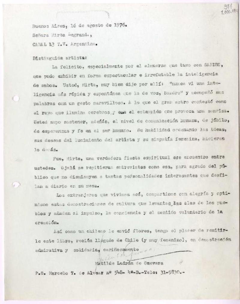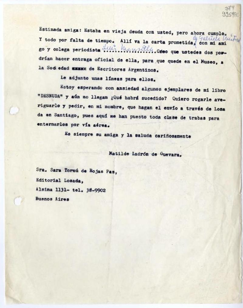 [Carta] 1952 julio 24, Buenos Aires, [Argentina] [a la] Sra. Matilde Ladrón de Guevara, Santiago de Chile [manuscrito] Tomás de Lara.