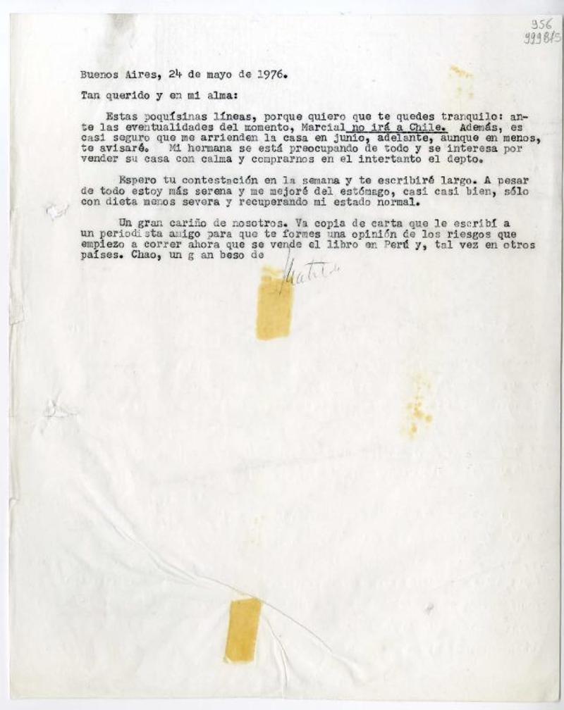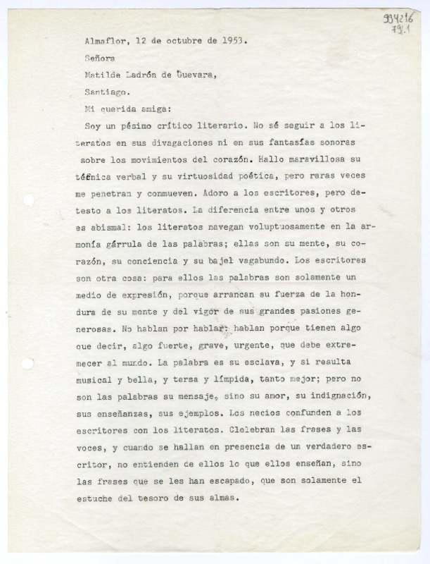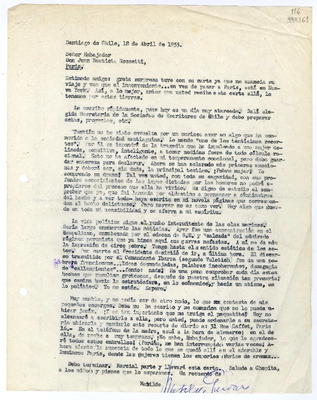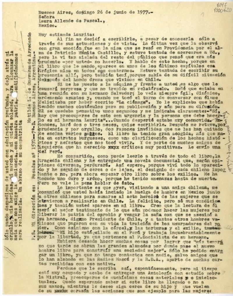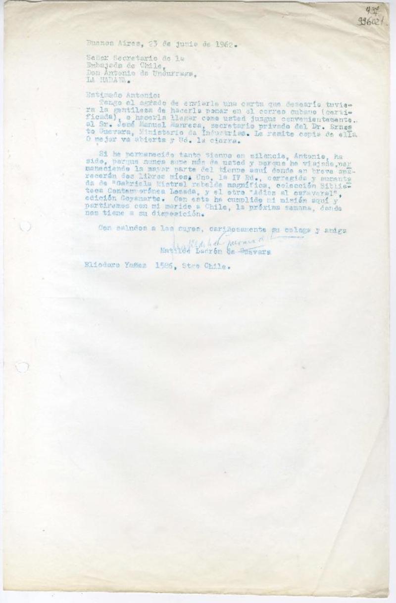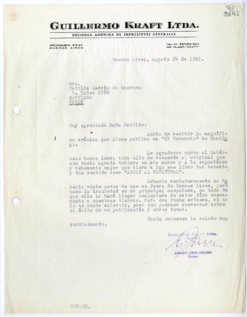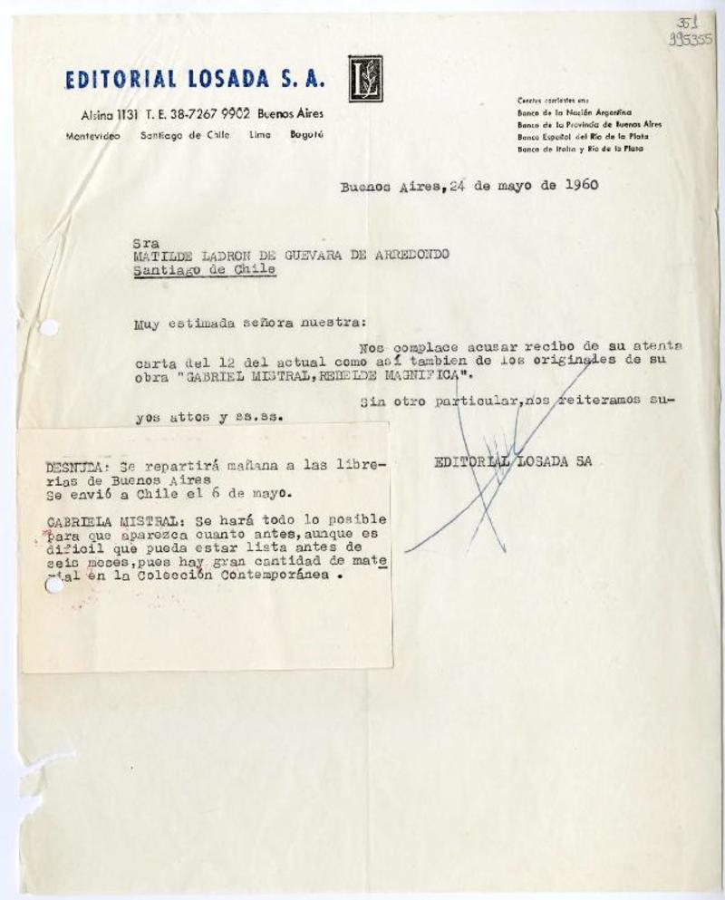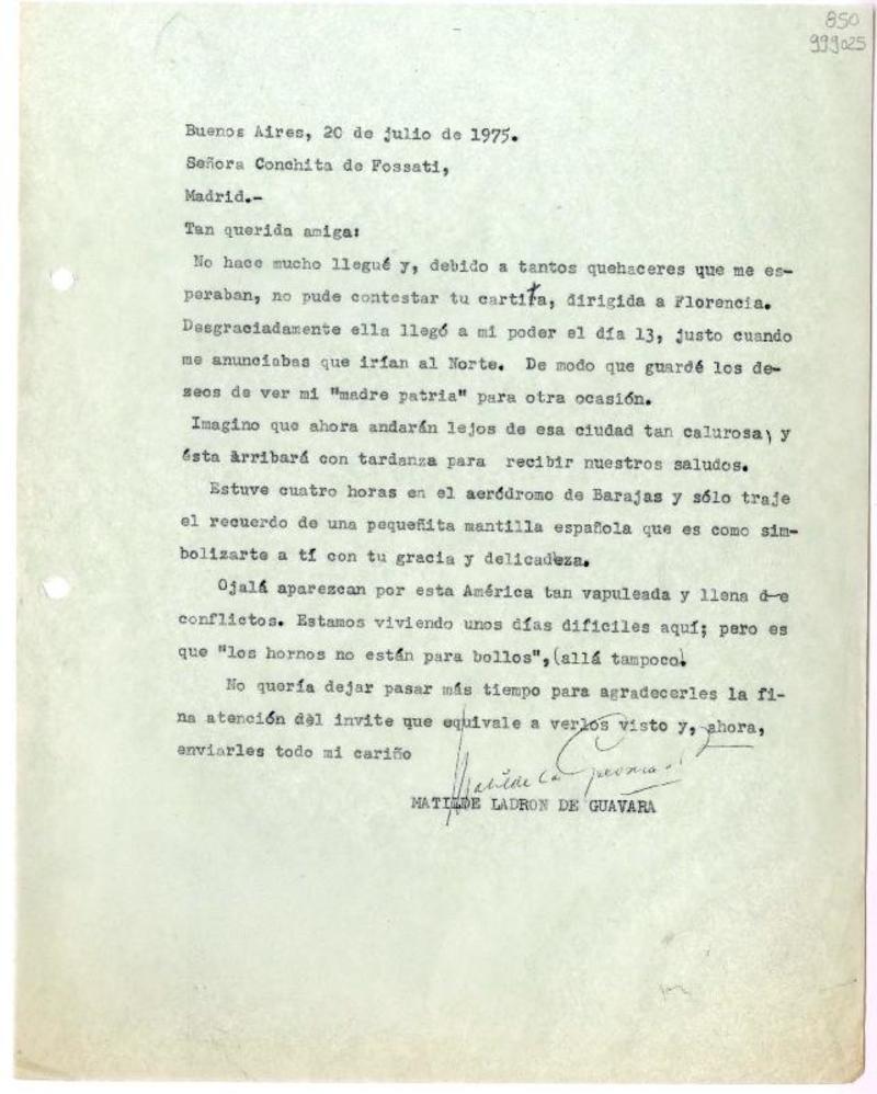 [Carta] 1952 julio 24, Buenos Aires, [Argentina] [a la] Sra. Matilde Ladrón de Guevara, Santiago de Chile [manuscrito] Tomás de Lara.