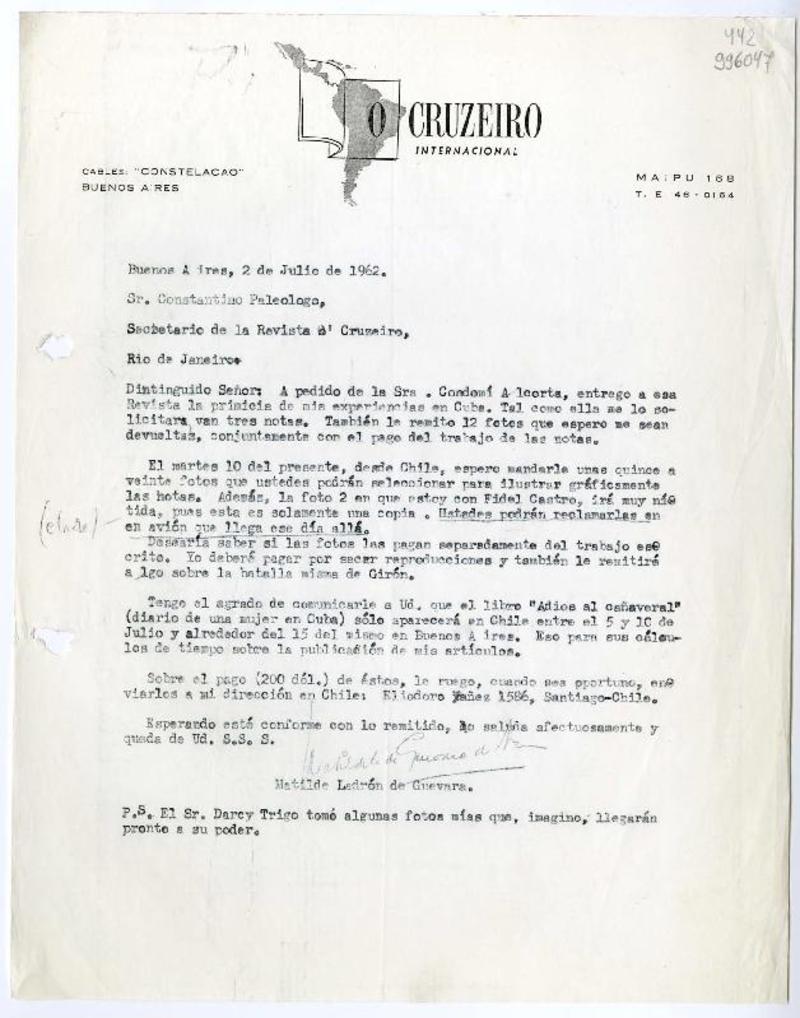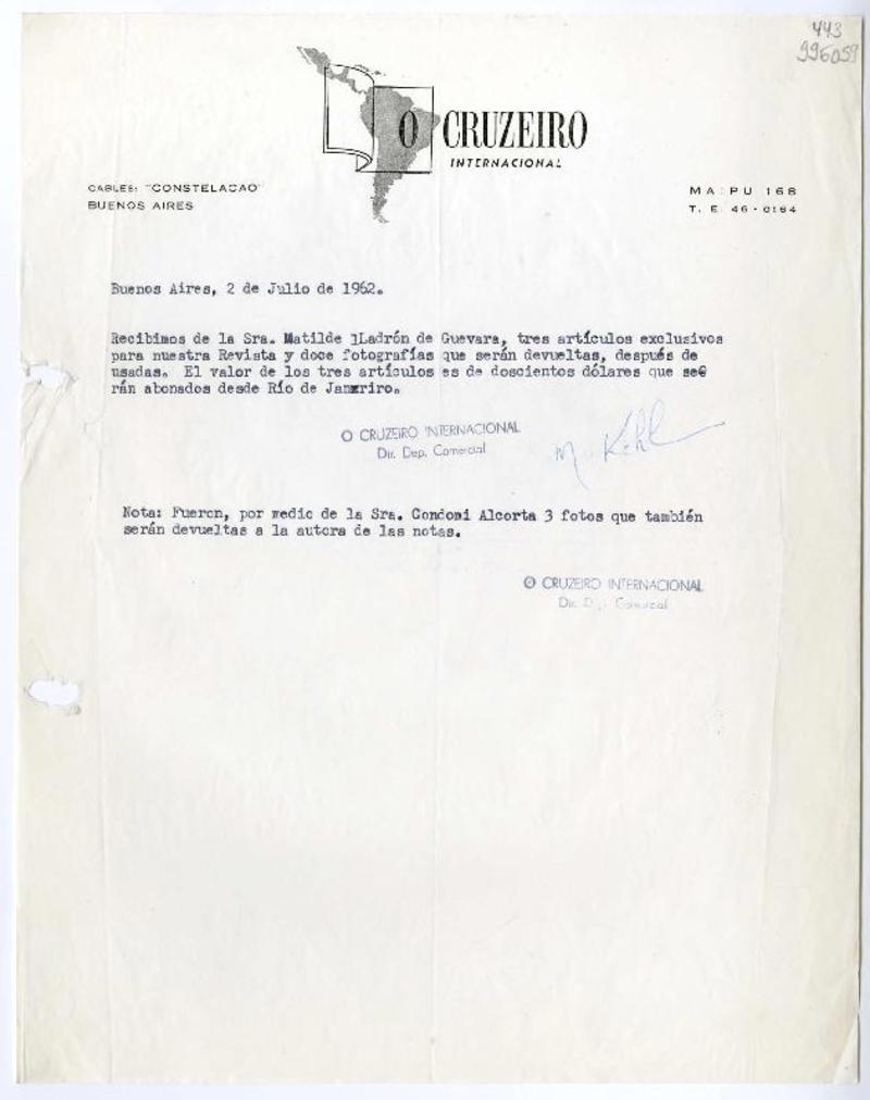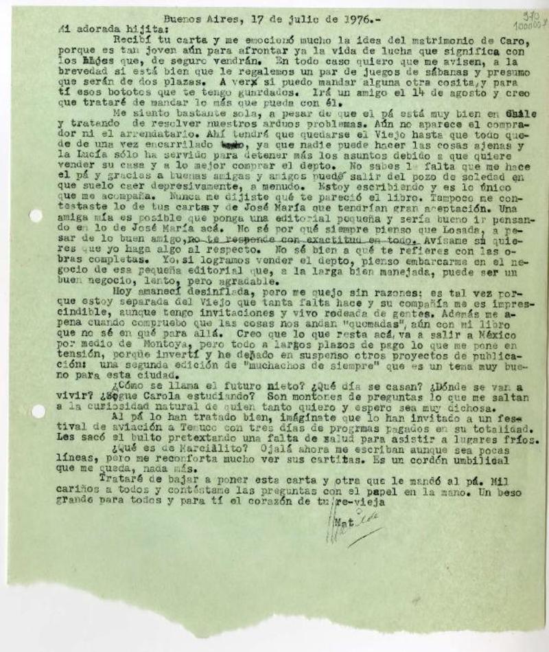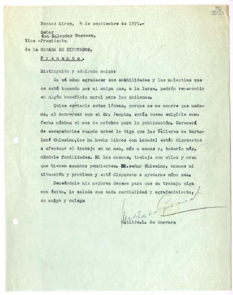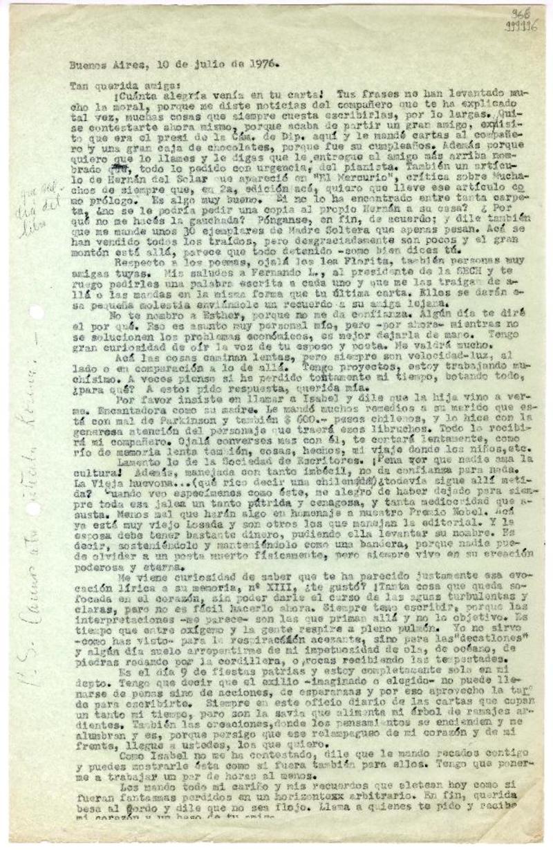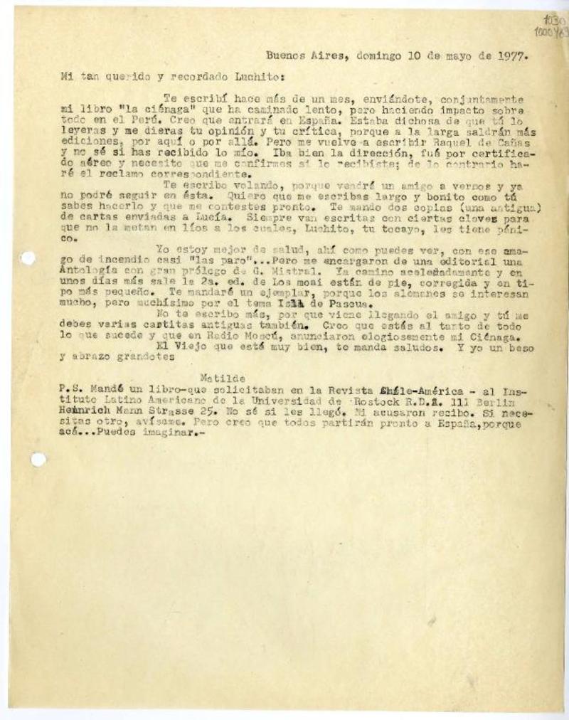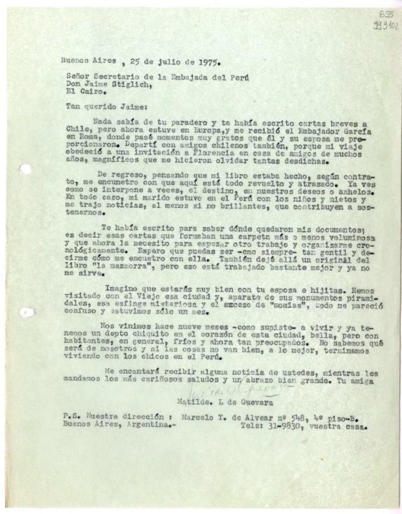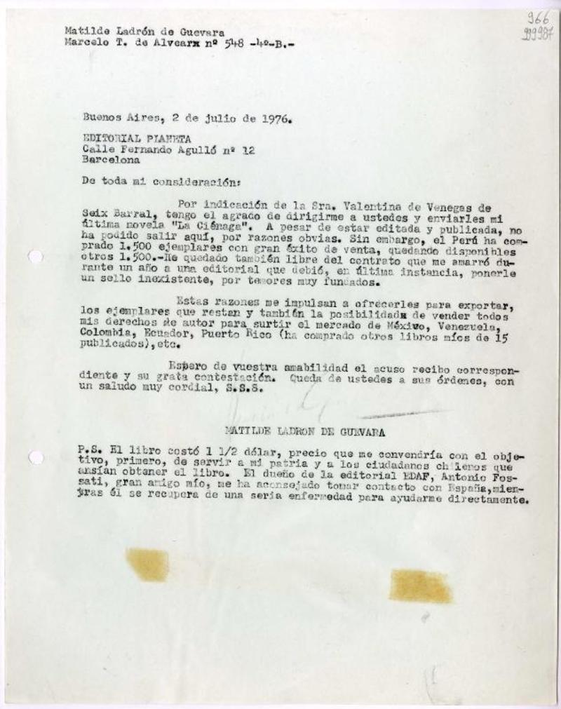 [Carta] 1952 julio 24, Buenos Aires, [Argentina] [a la] Sra. Matilde Ladrón de Guevara, Santiago de Chile [manuscrito] Tomás de Lara.