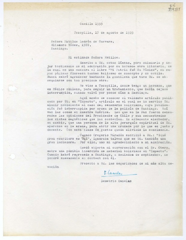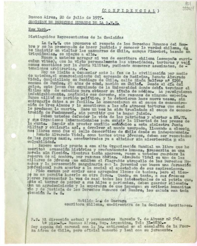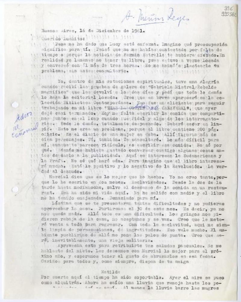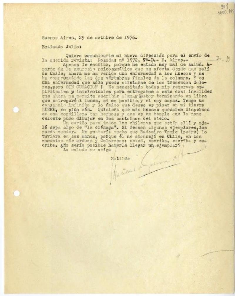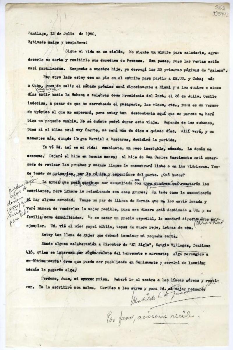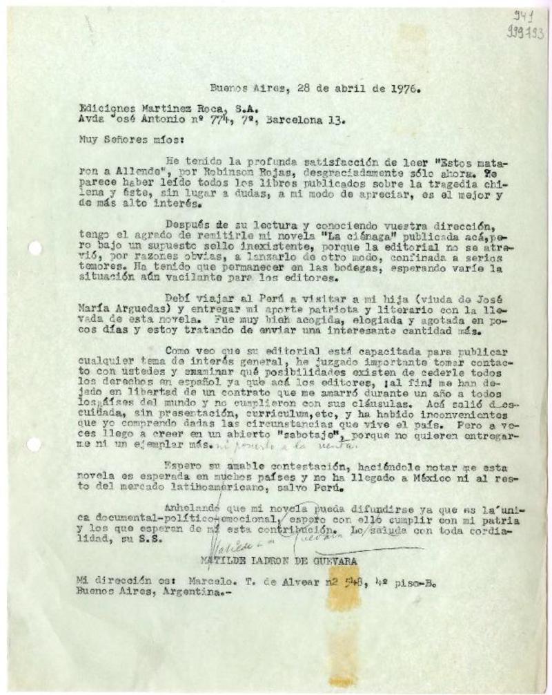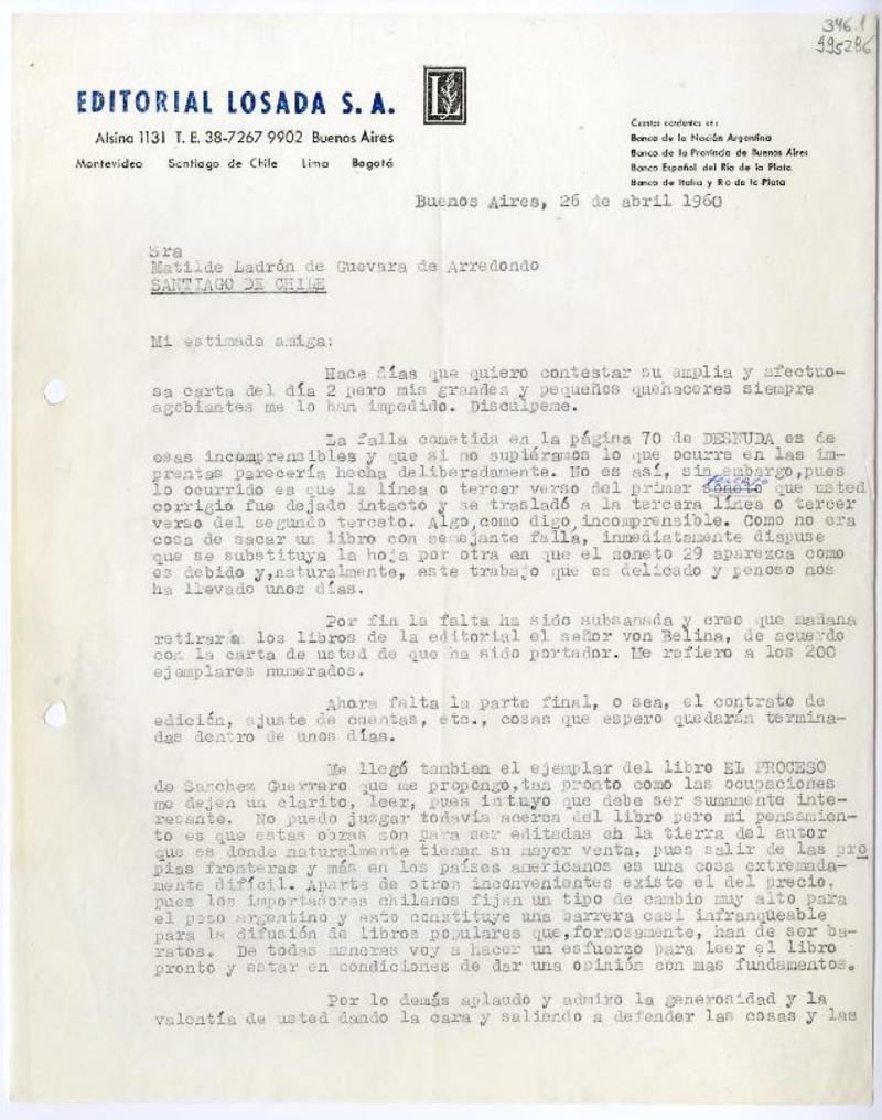 [Carta] 1952 julio 24, Buenos Aires, [Argentina] [a la] Sra. Matilde Ladrón de Guevara, Santiago de Chile [manuscrito] Tomás de Lara.