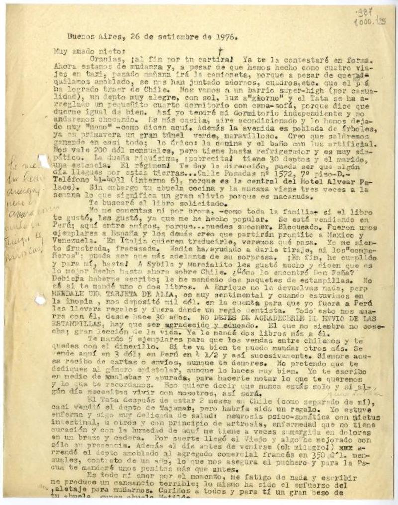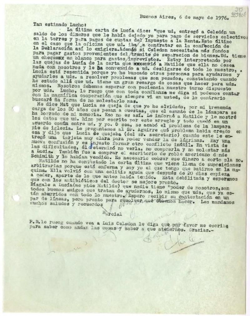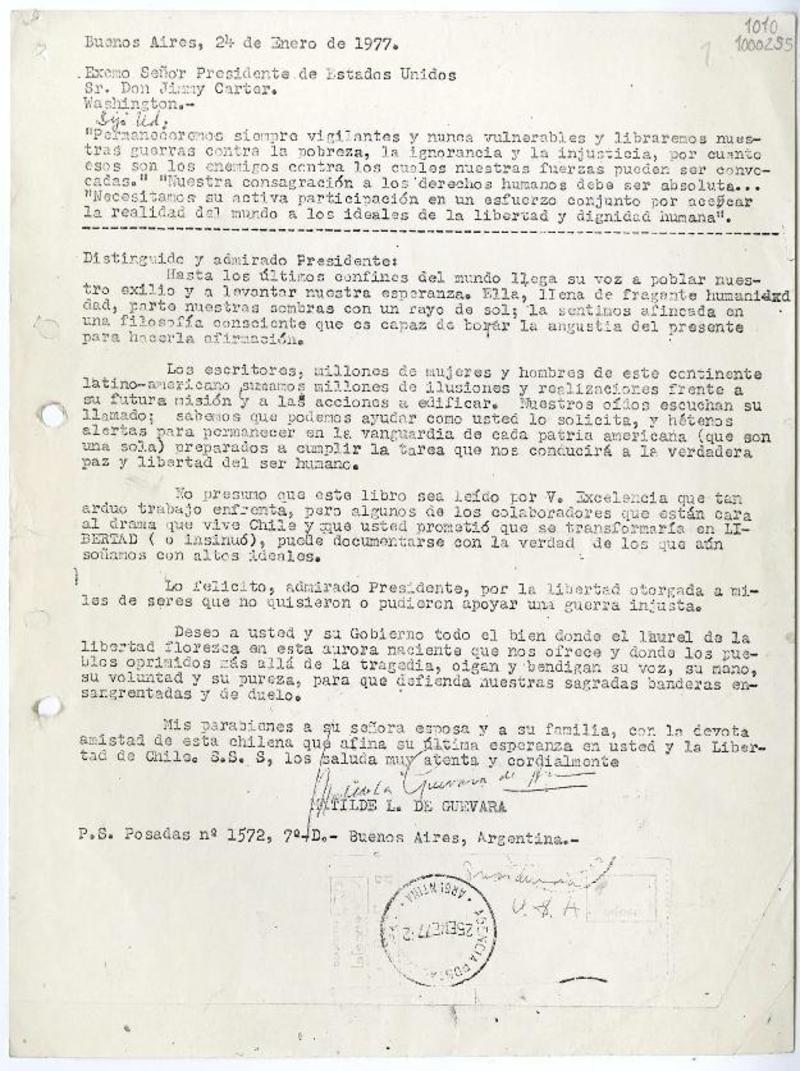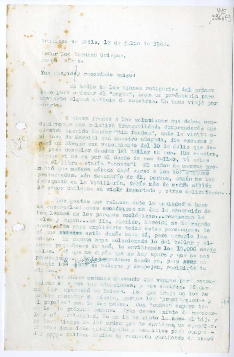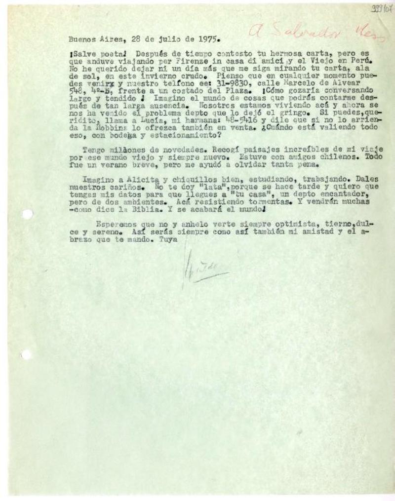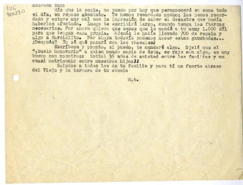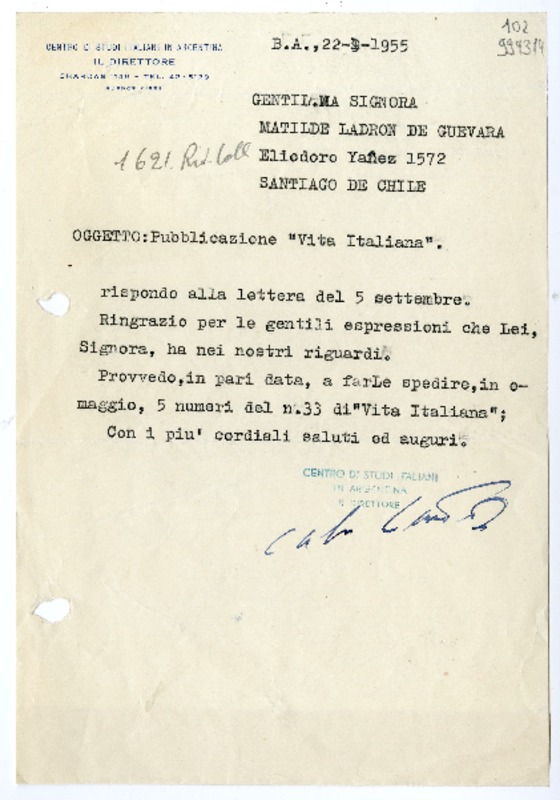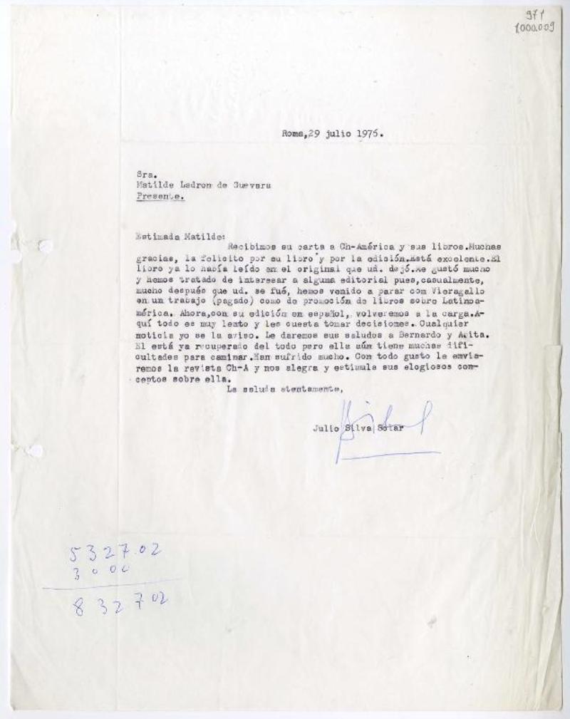 [Carta] 1952 julio 24, Buenos Aires, [Argentina] [a la] Sra. Matilde Ladrón de Guevara, Santiago de Chile [manuscrito] Tomás de Lara.
