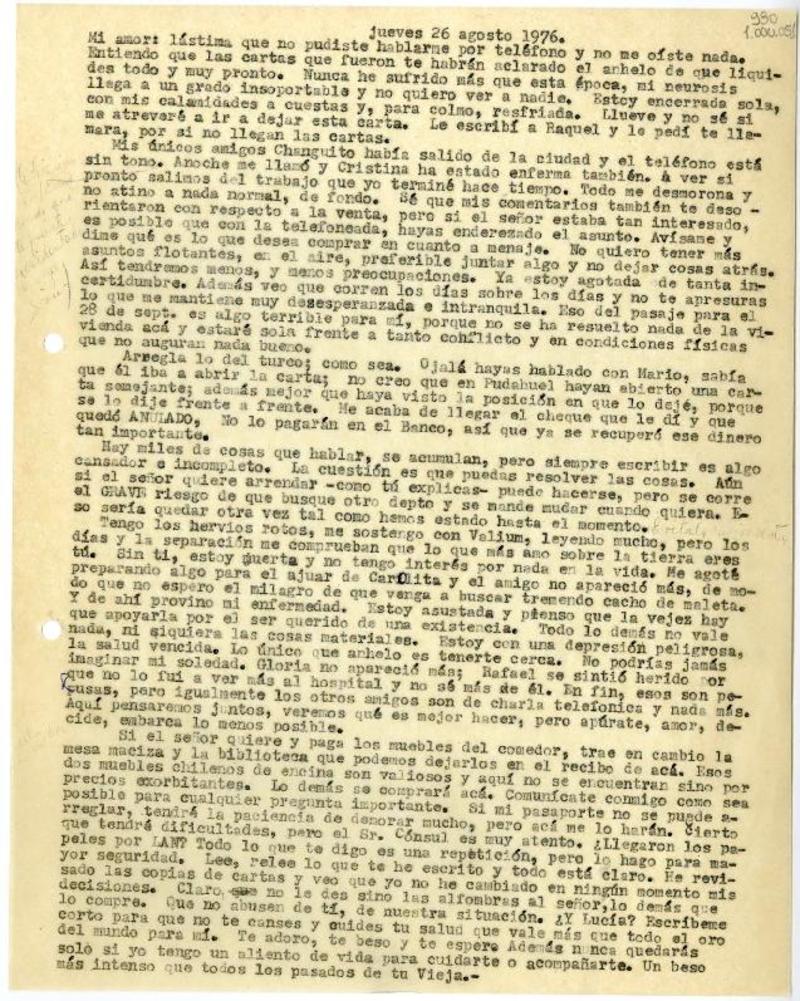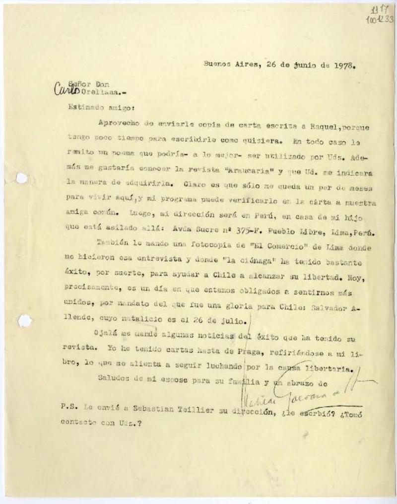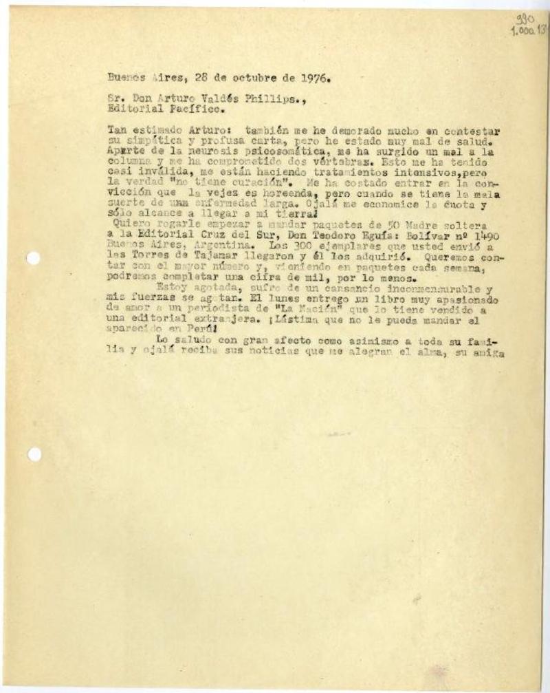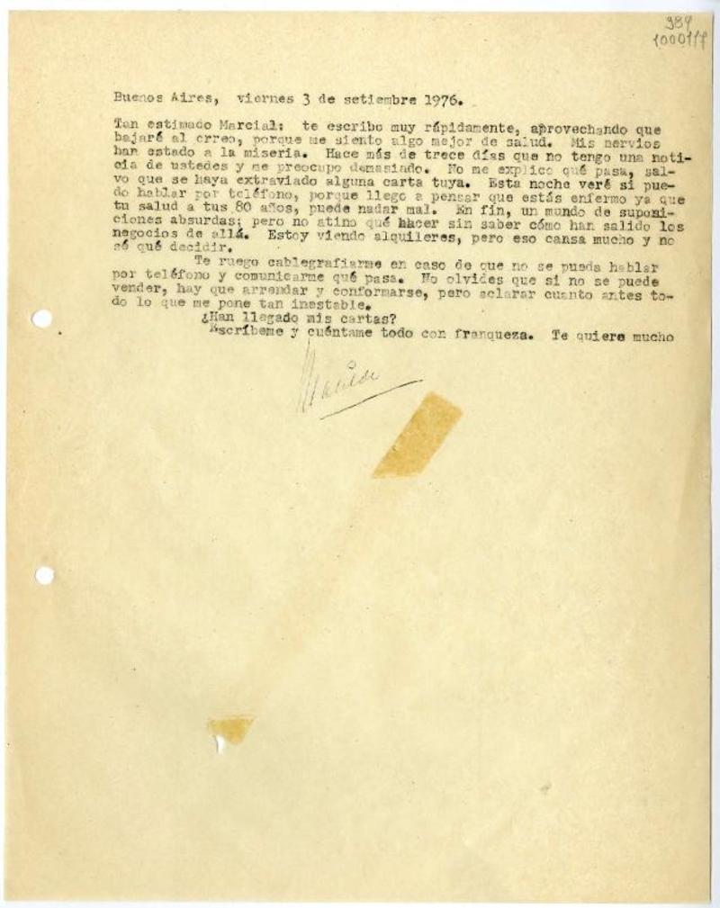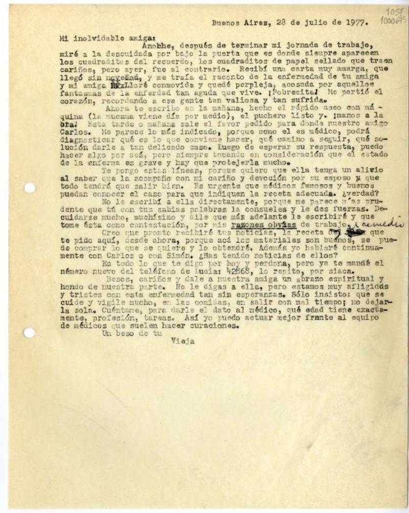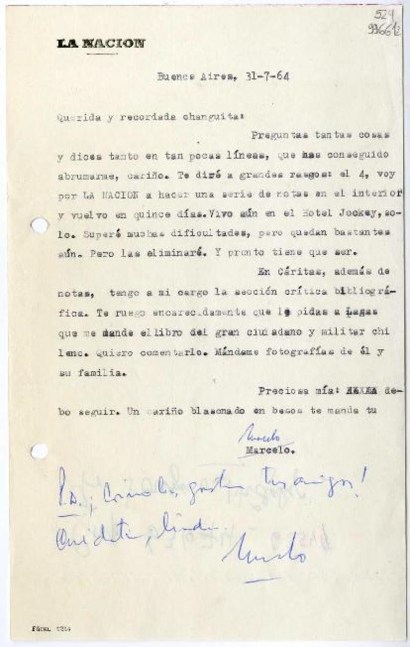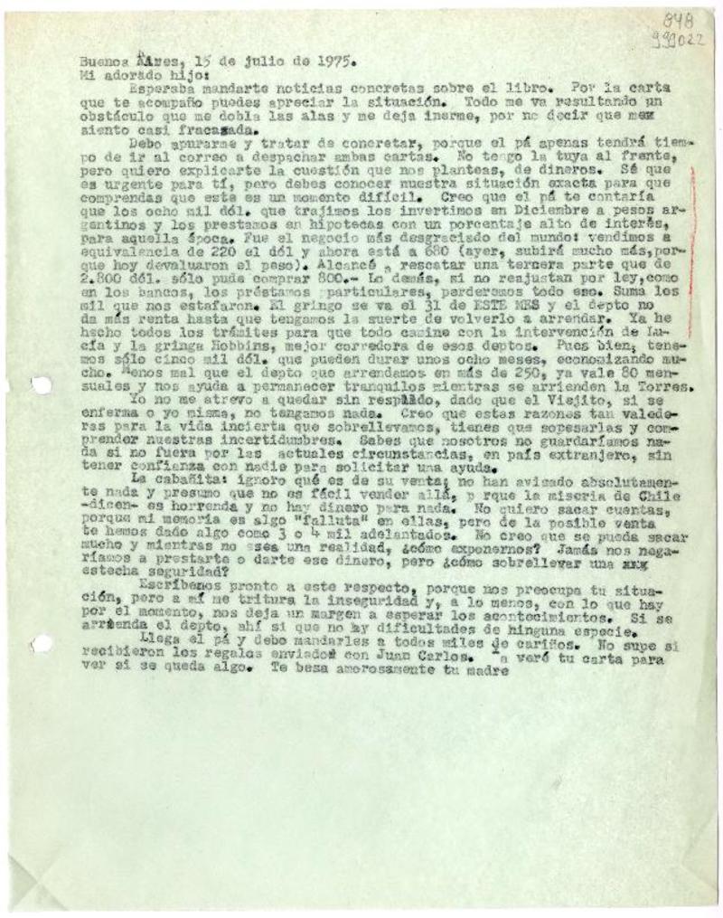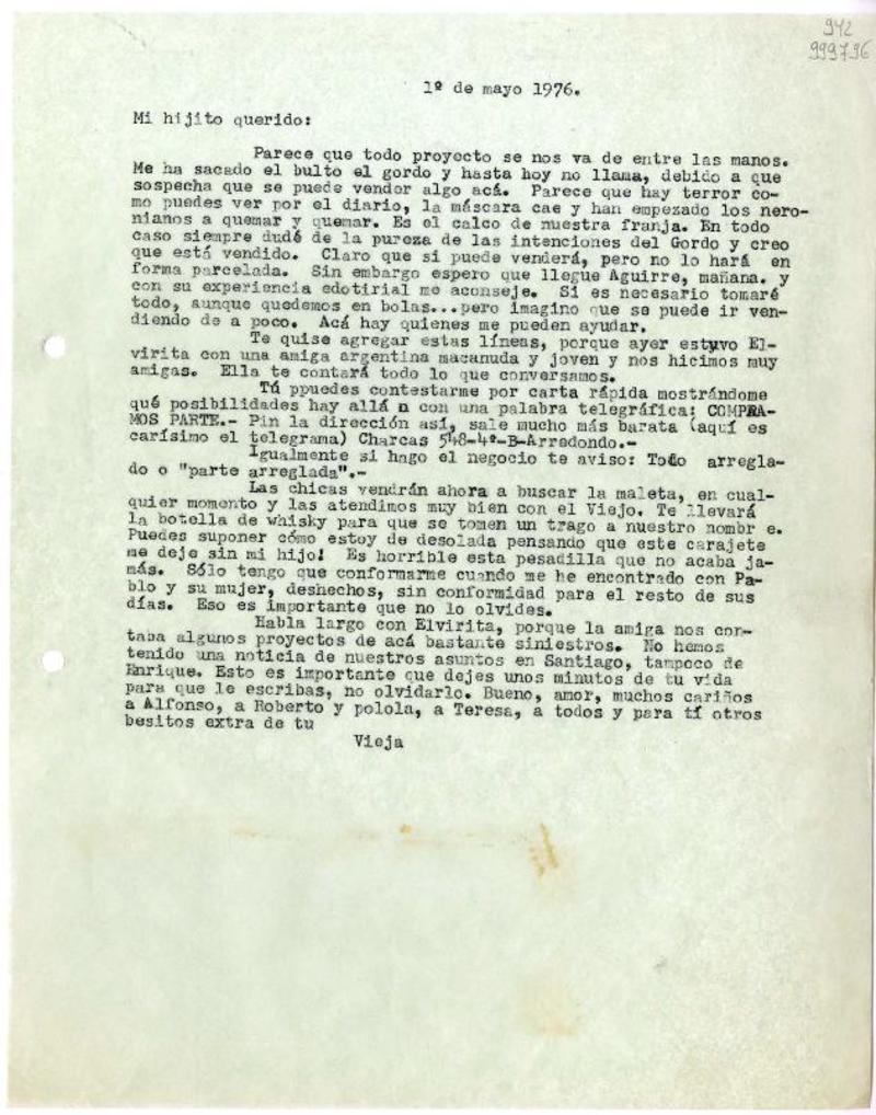 [Carta] 1952 julio 24, Buenos Aires, [Argentina] [a la] Sra. Matilde Ladrón de Guevara, Santiago de Chile [manuscrito] Tomás de Lara.