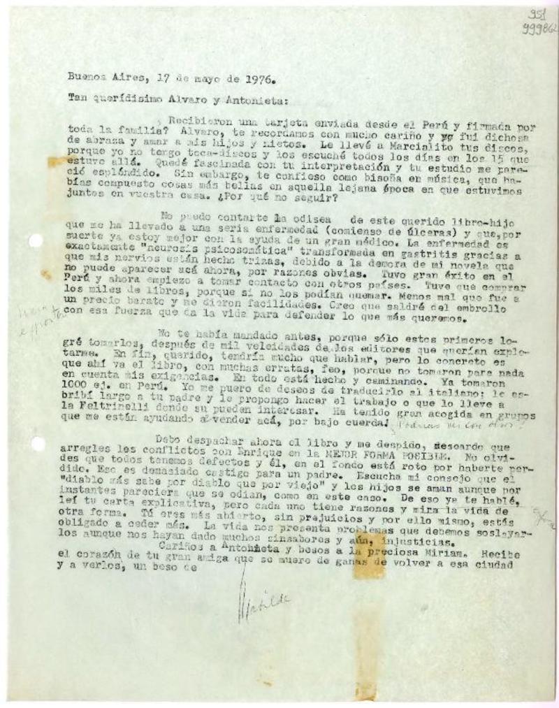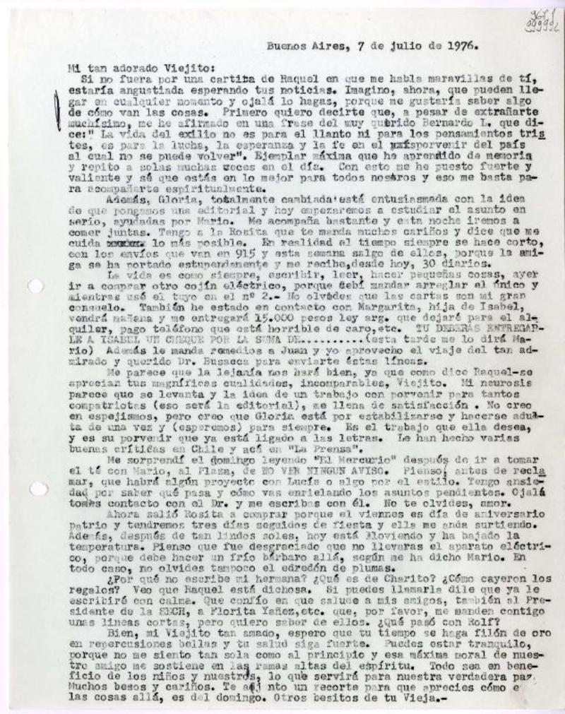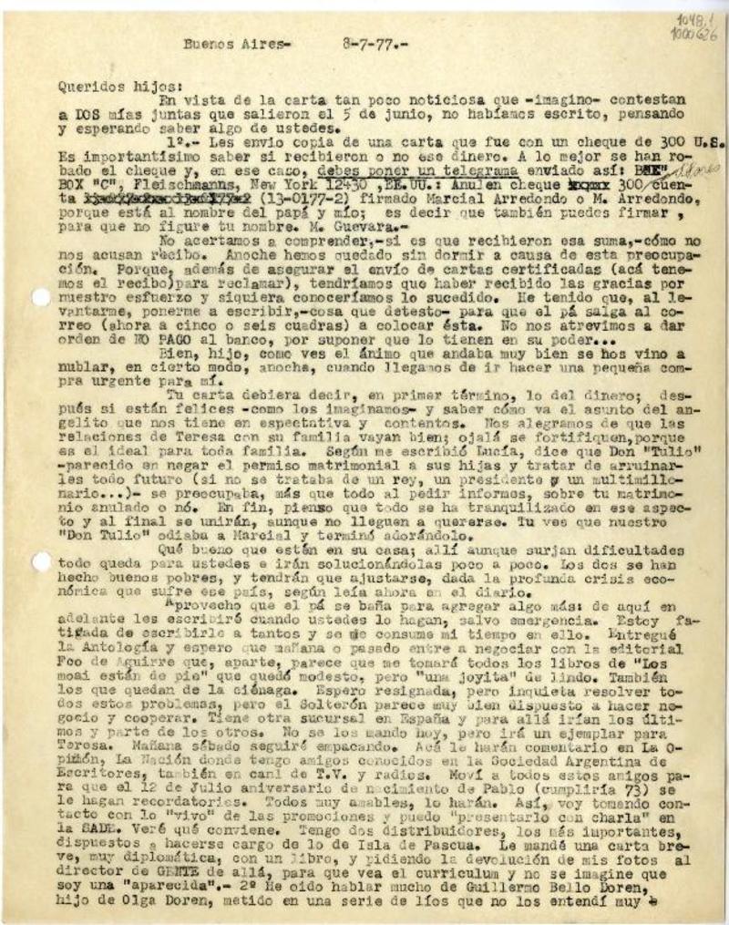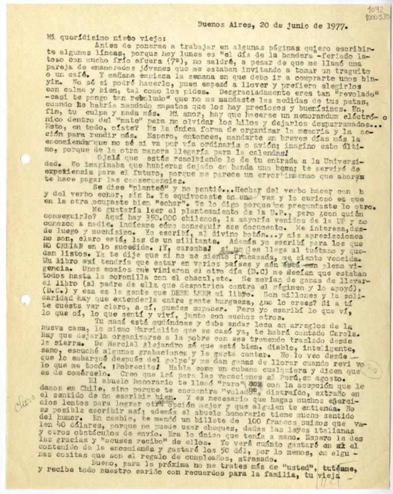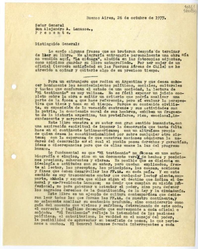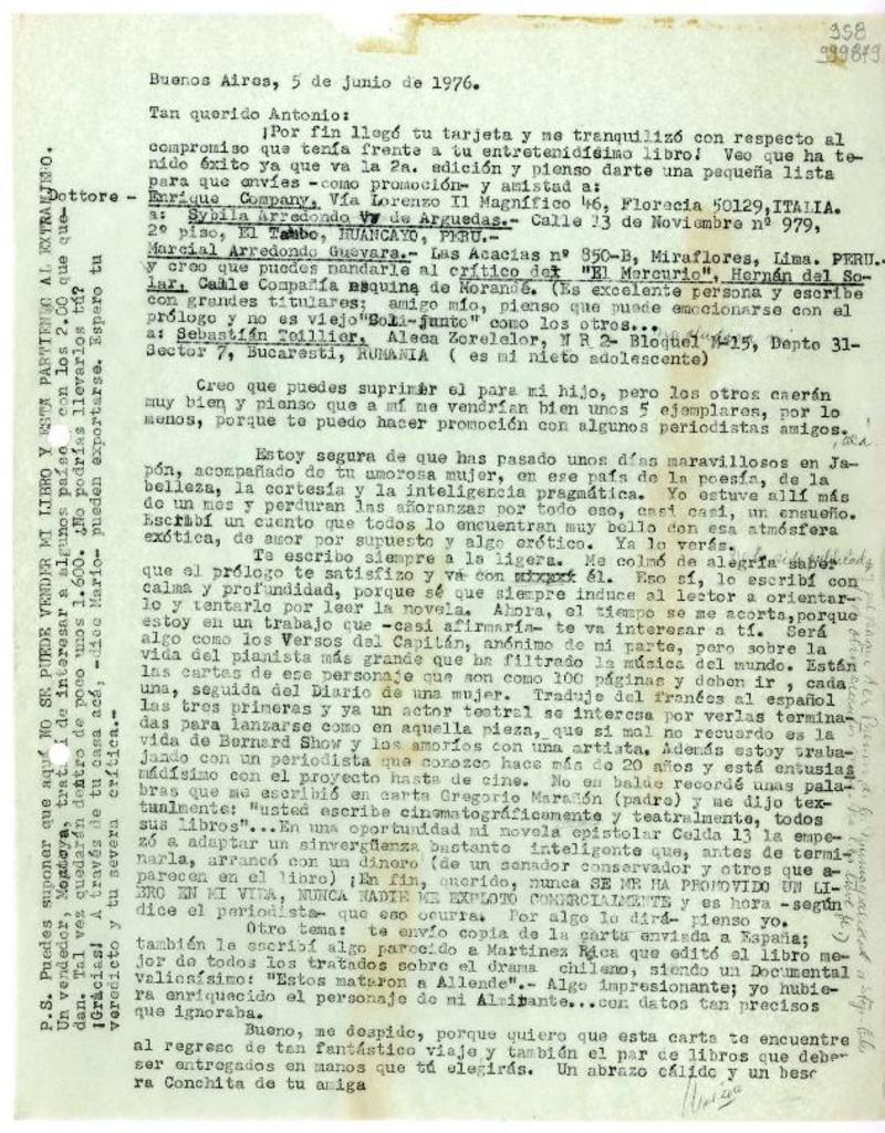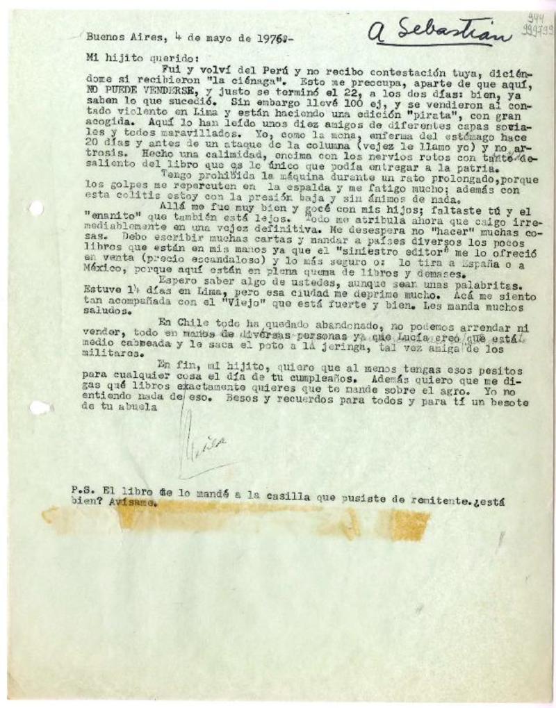 [Carta] 1952 julio 24, Buenos Aires, [Argentina] [a la] Sra. Matilde Ladrón de Guevara, Santiago de Chile [manuscrito] Tomás de Lara.