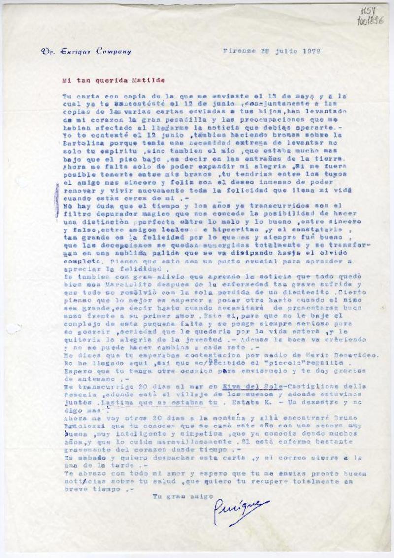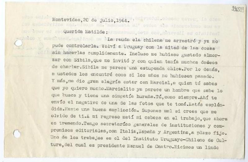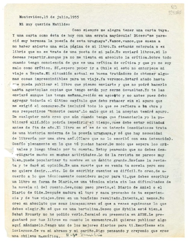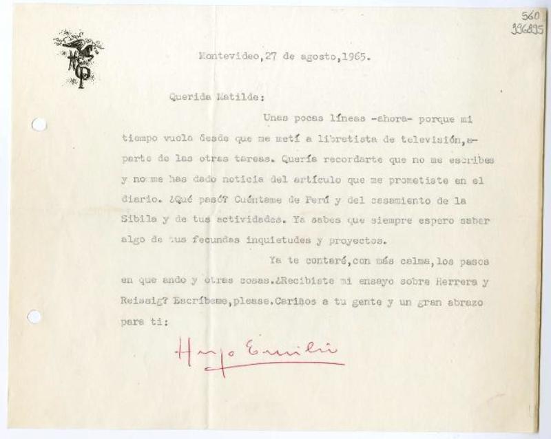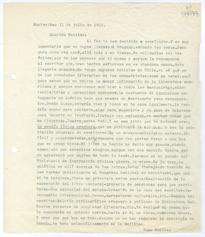 [Carta] 1952 julio 31, Montevideo, [Uruguay] [a la] Querida Matilde [manuscrito] Hugo Emilio [Pedemonte].