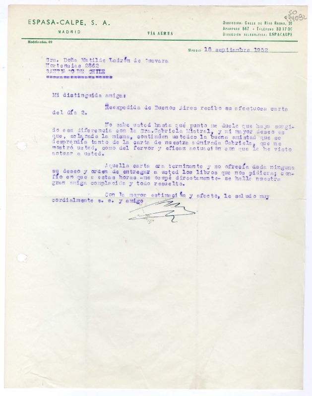 [Carta] 1952 septiembre 18, Madrid, [España] [a la] Sra. Doña Matilde Ladrón de Guevara, Hortensias 2862, Santiago de Chile [manuscrito] Espasa-Calpe Madrid.