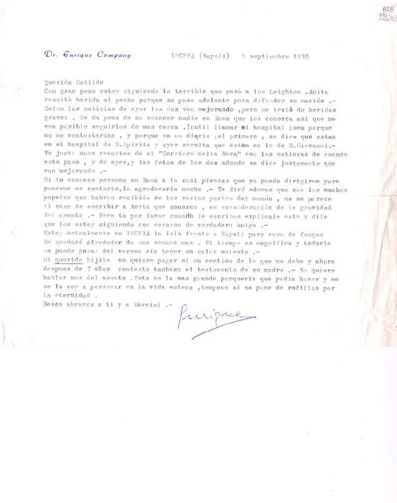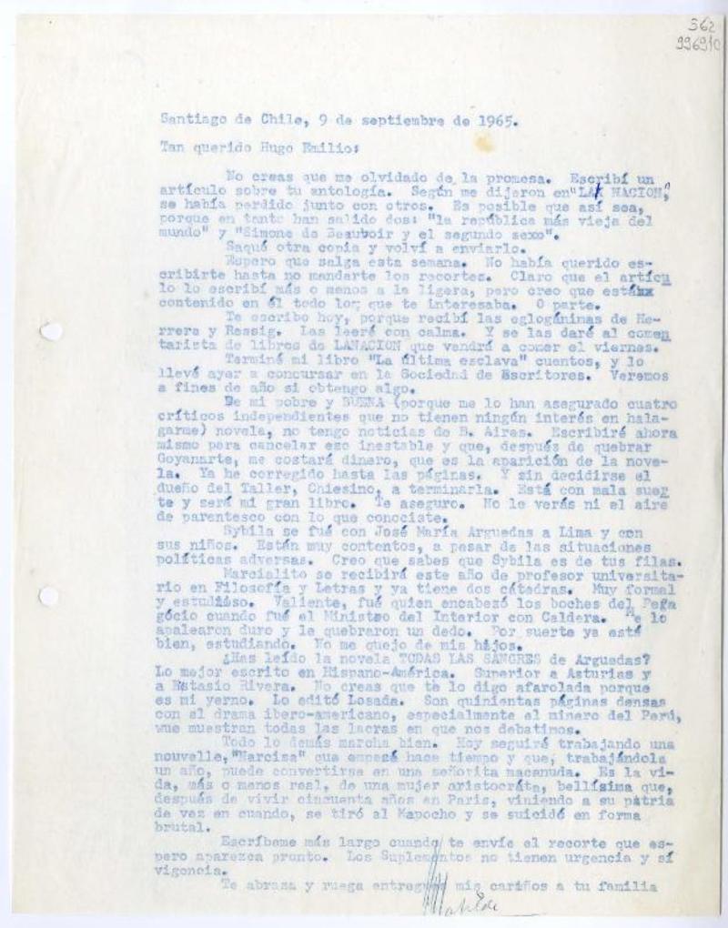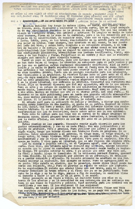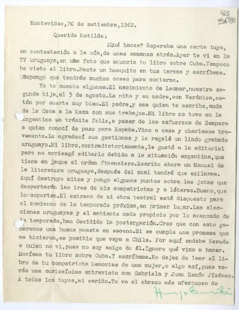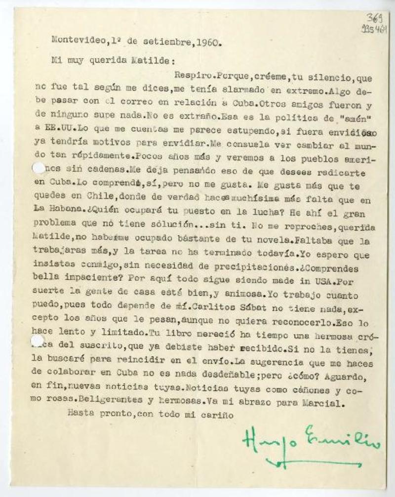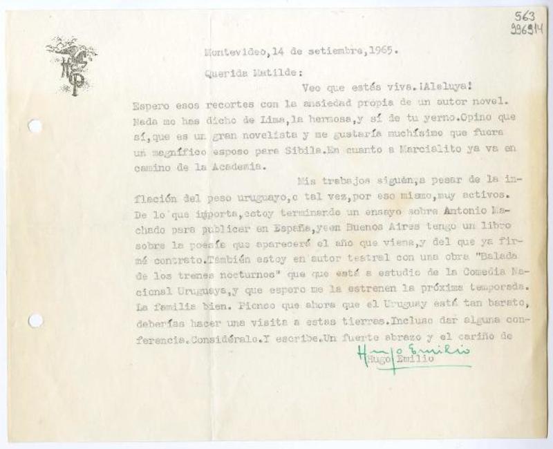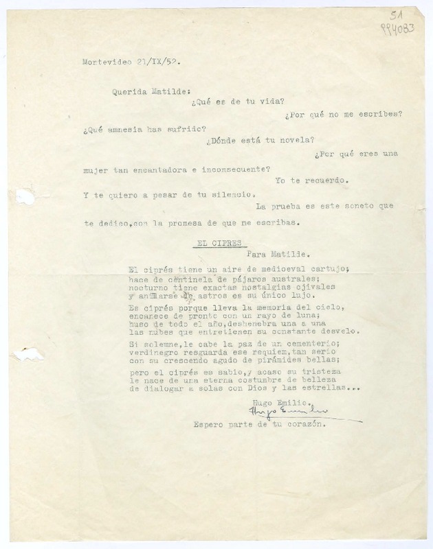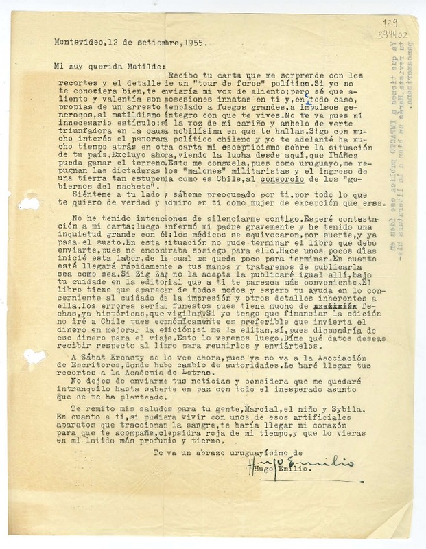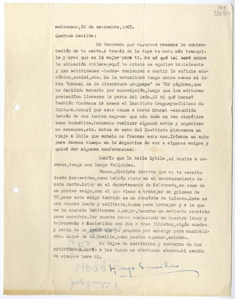 [Carta] 1952 septiembre 21, Montevideo, [Uruguay] [a la] Querida Matilde [manuscrito] Hugo Emilio [Pedemonte].