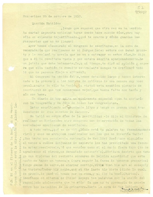[Carta] 1952 octubre 28, Montevideo, [Uruguay] [a la] Querida Matilde [manuscrito] Hugo Emilio [Pedemonte].