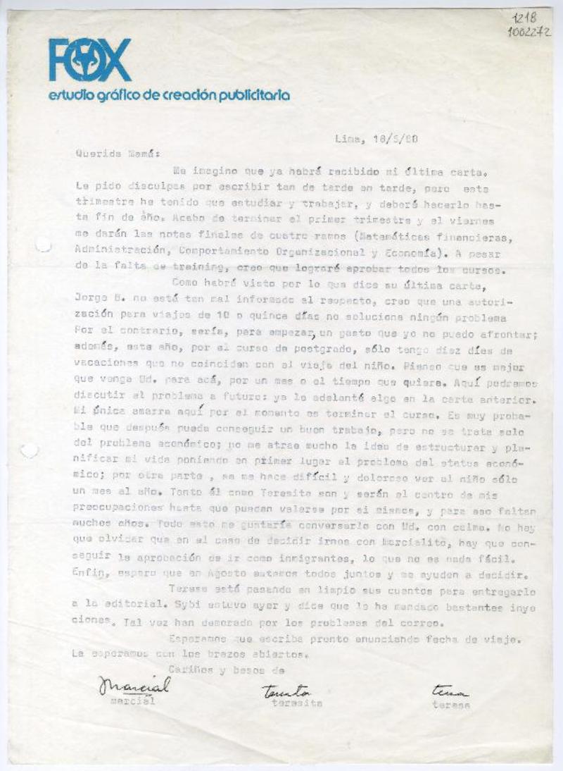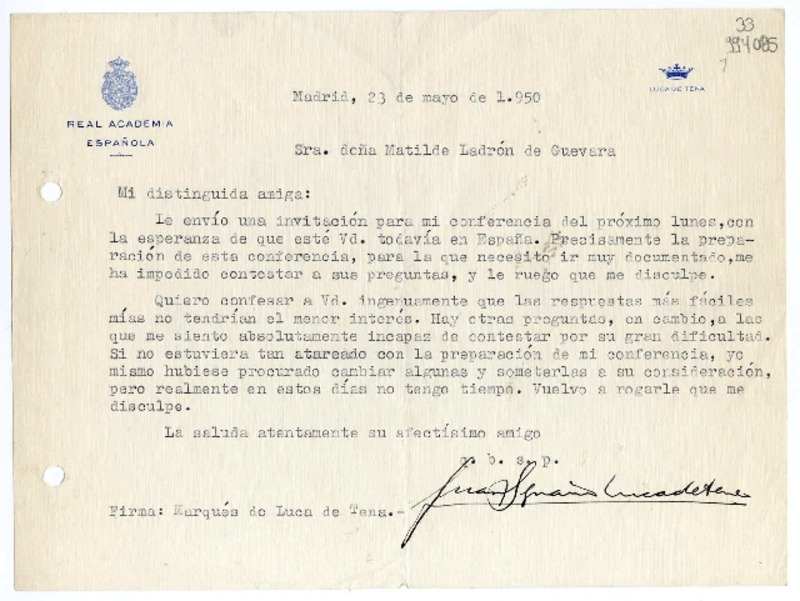 [Carta] 1950 mayo 23, Madrid, [España] [a] Matilde Ladrón de Guevara [manuscrito] Juan Ignacio Luca de Tena y García de Torres.