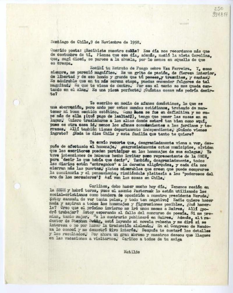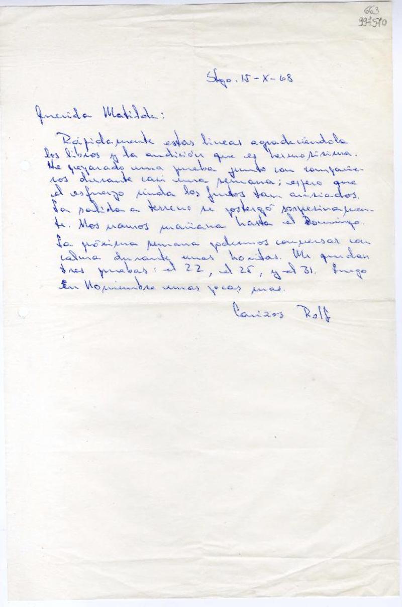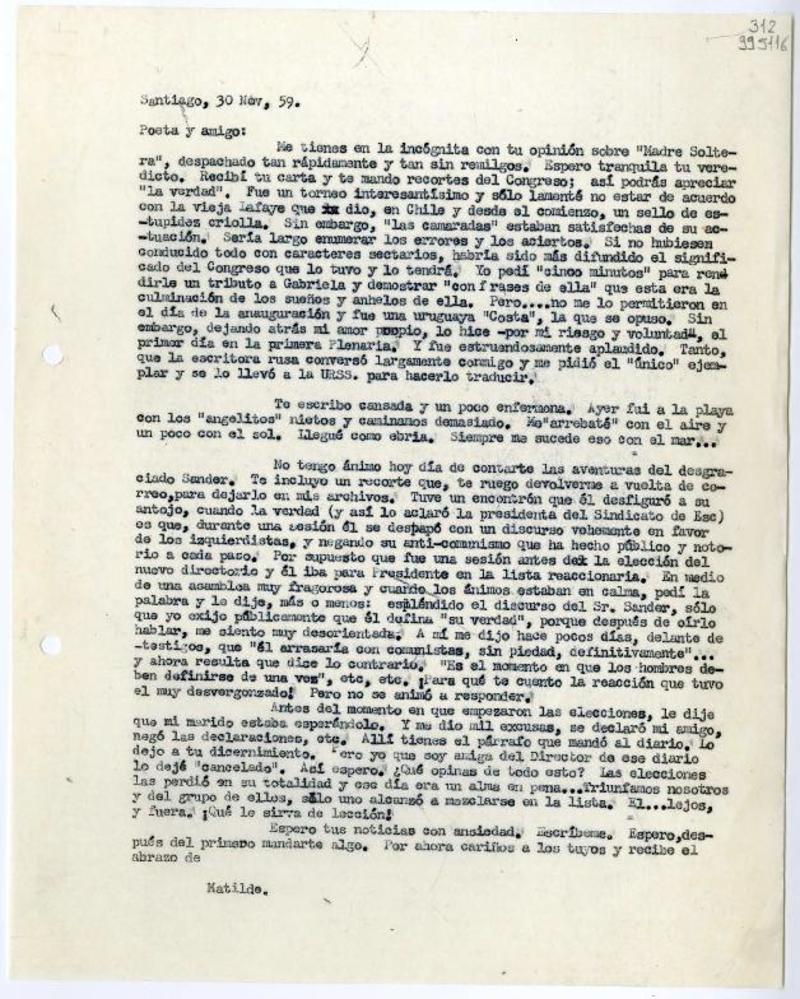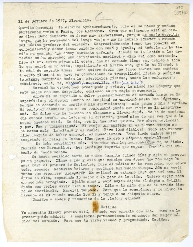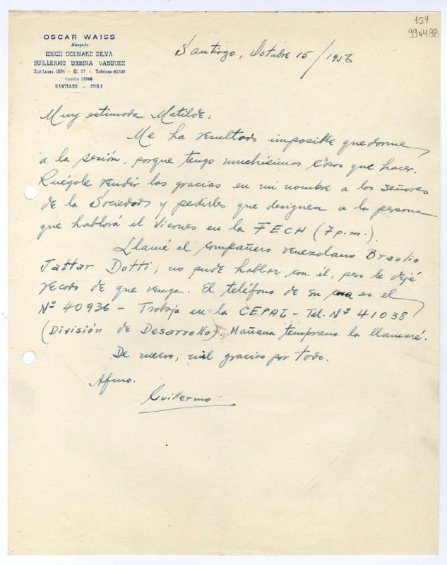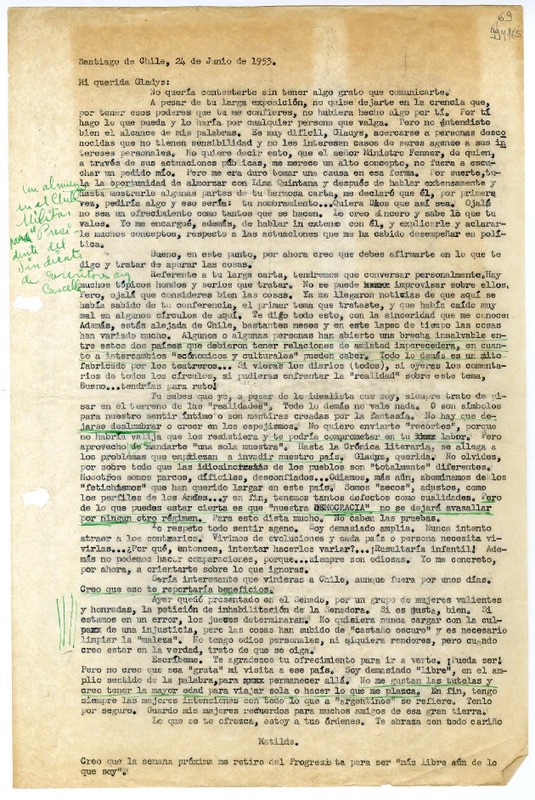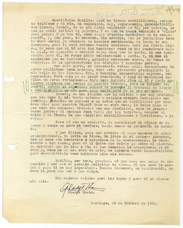 [Carta] 1952 octubre 30, Santiago, [Chile] [a la] Queridísima Matilde [manuscrito] Gladys Thein.