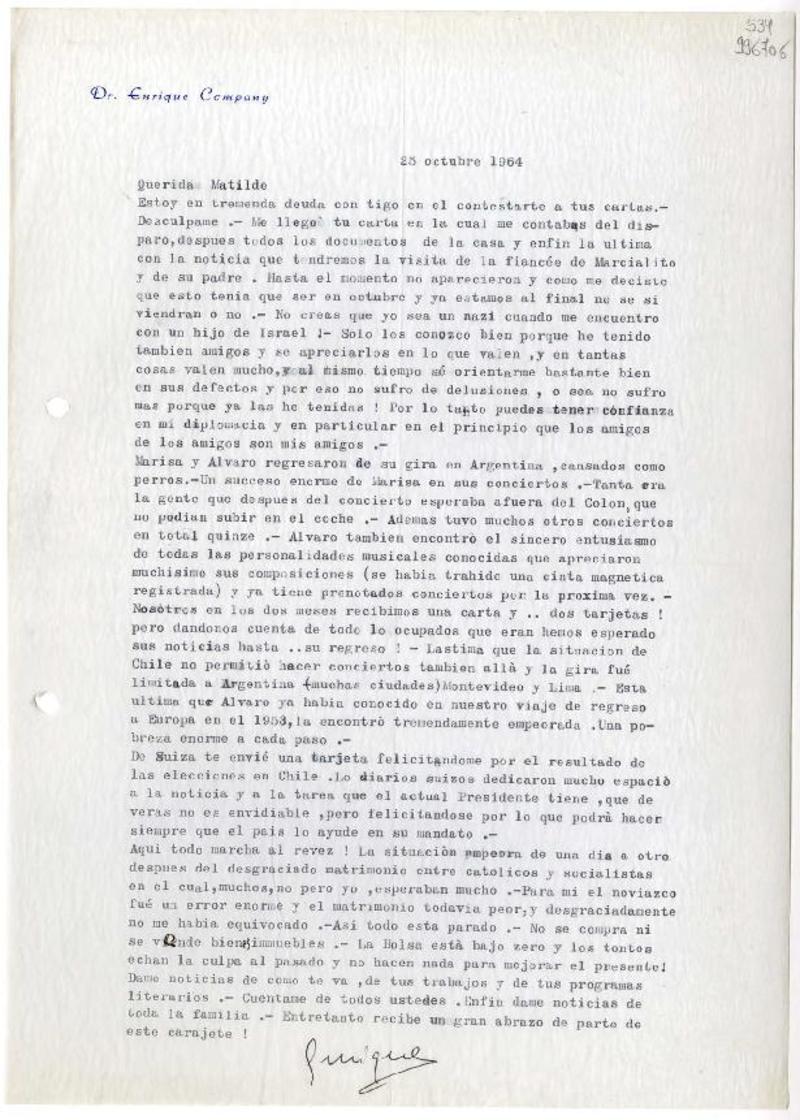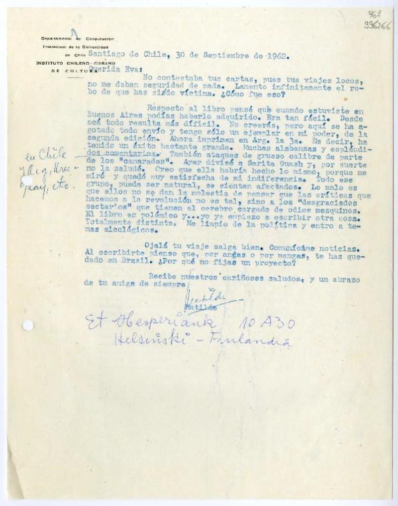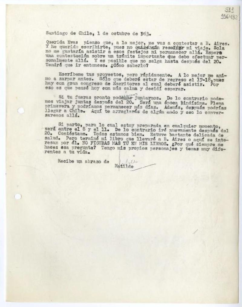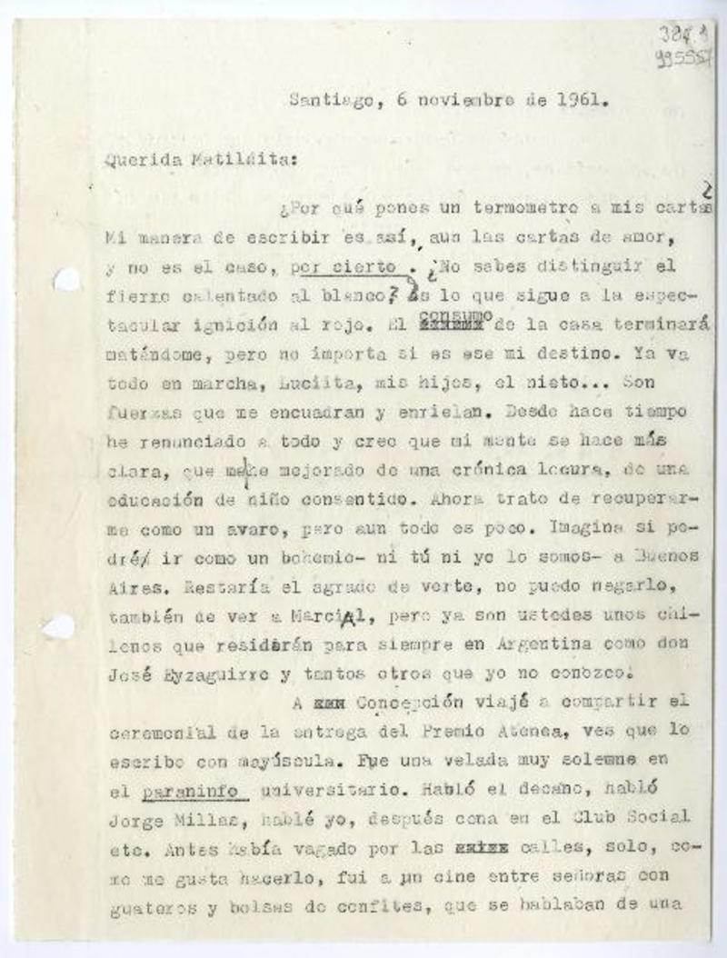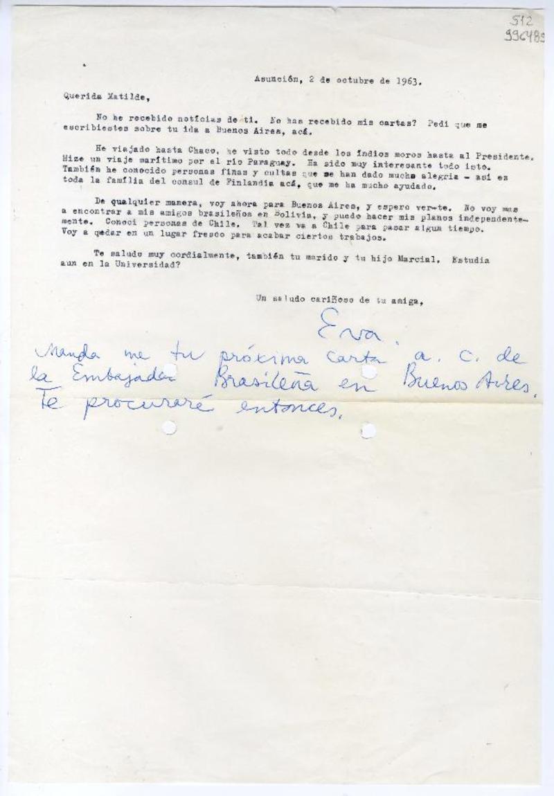 [Carta] 1952 octubre 30, Santiago, [Chile] [a la] Queridísima Matilde [manuscrito] Gladys Thein.