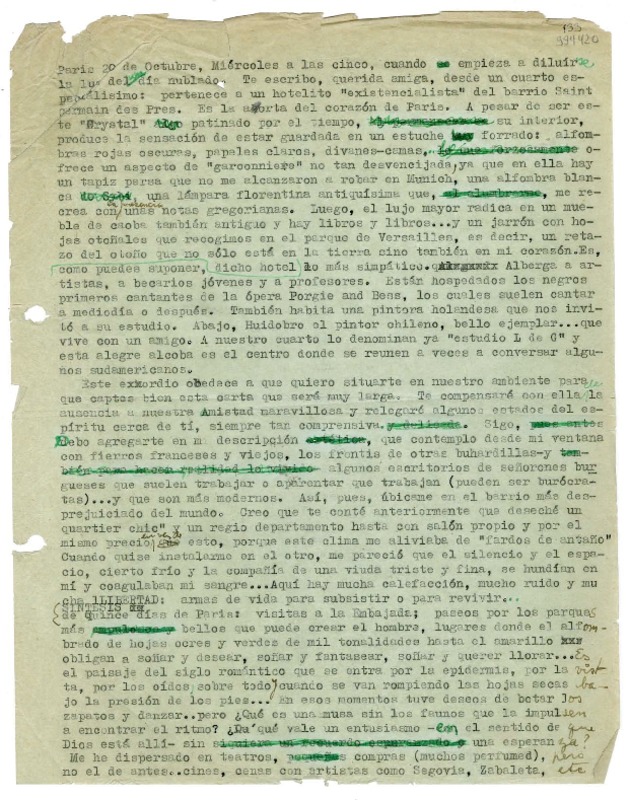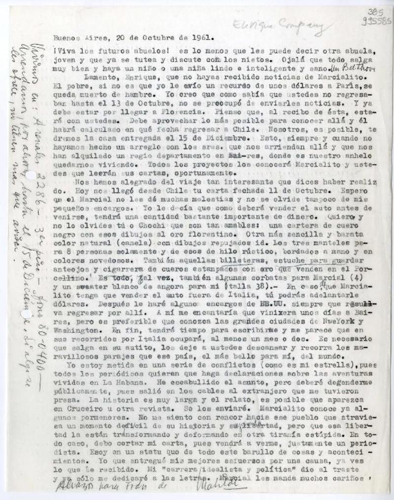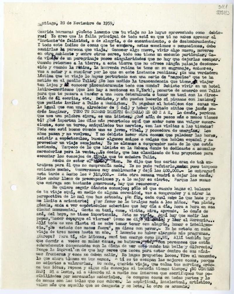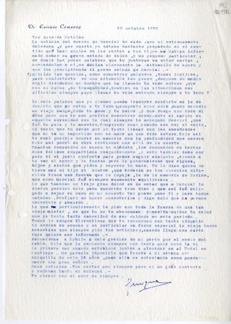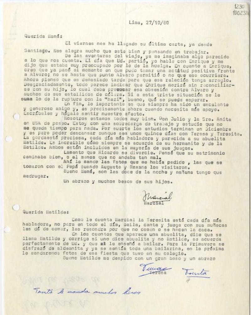 [Carta] 1952 octubre 30, Santiago, [Chile] [a la] Queridísima Matilde [manuscrito] Gladys Thein.