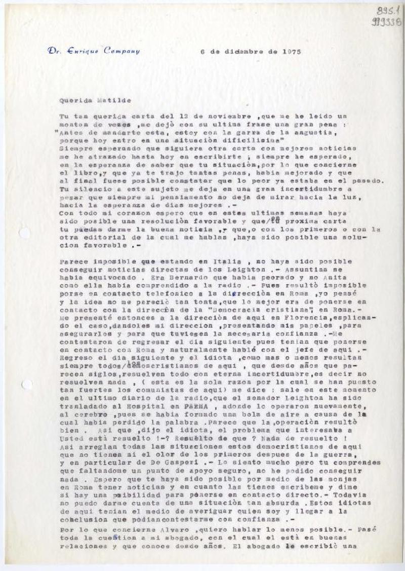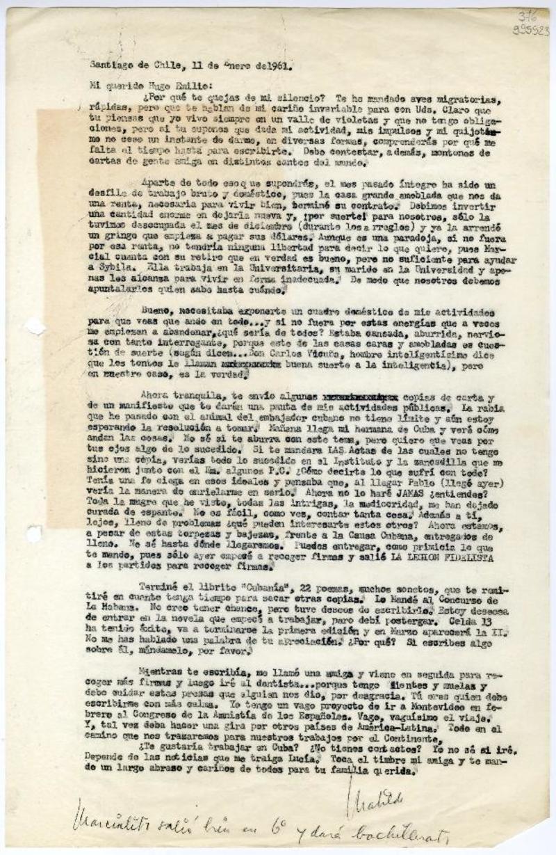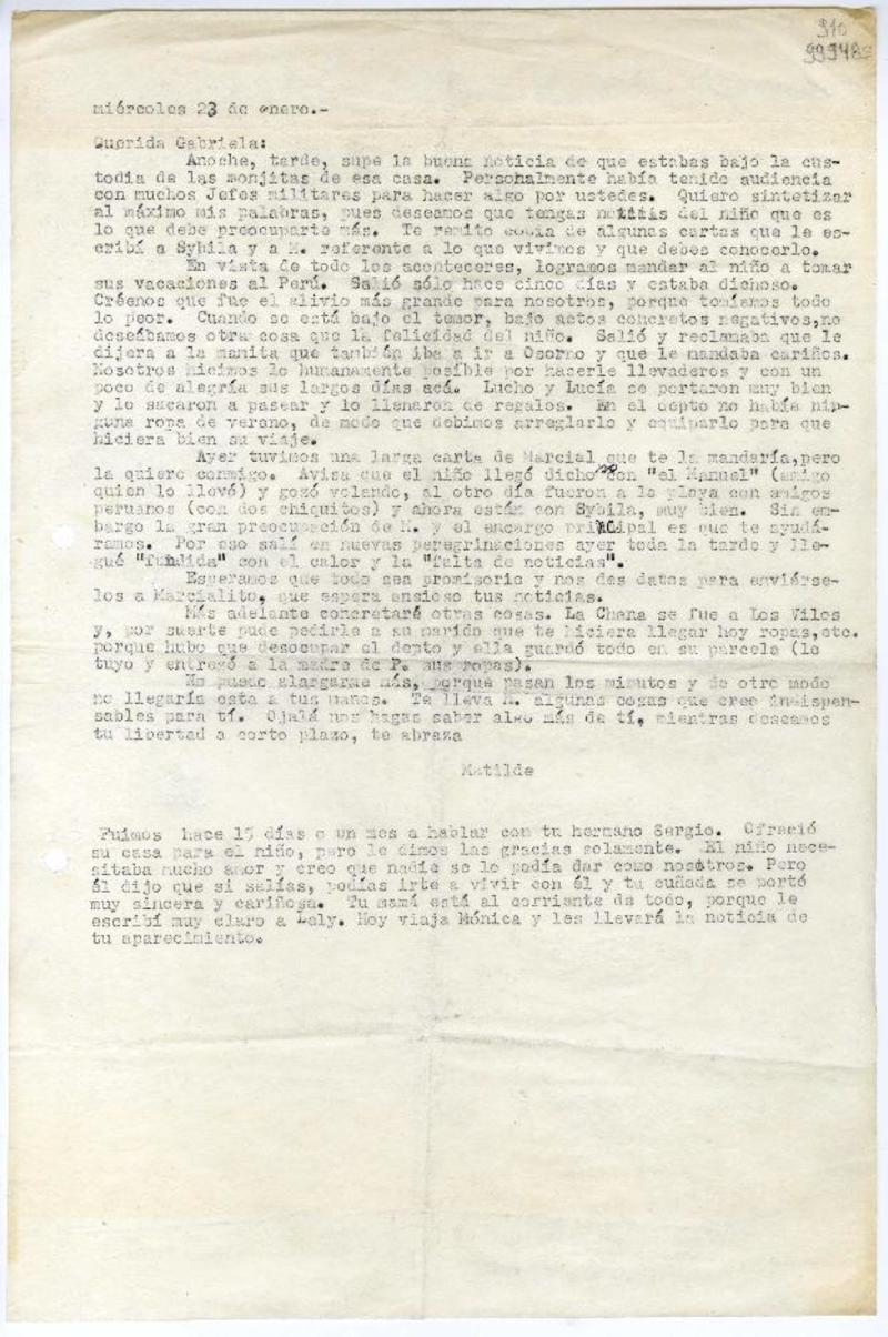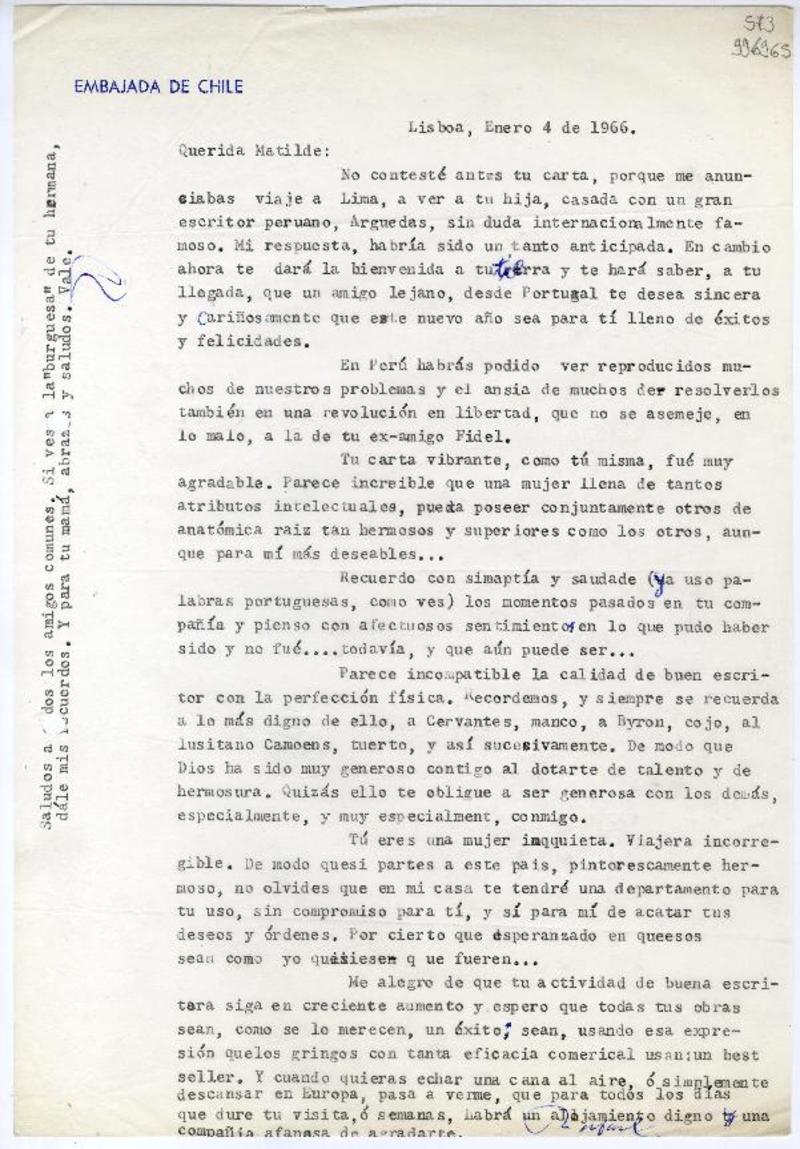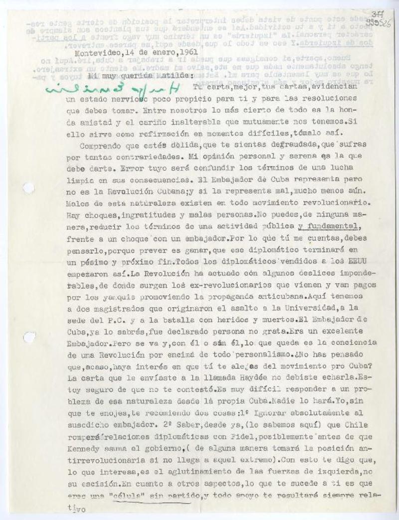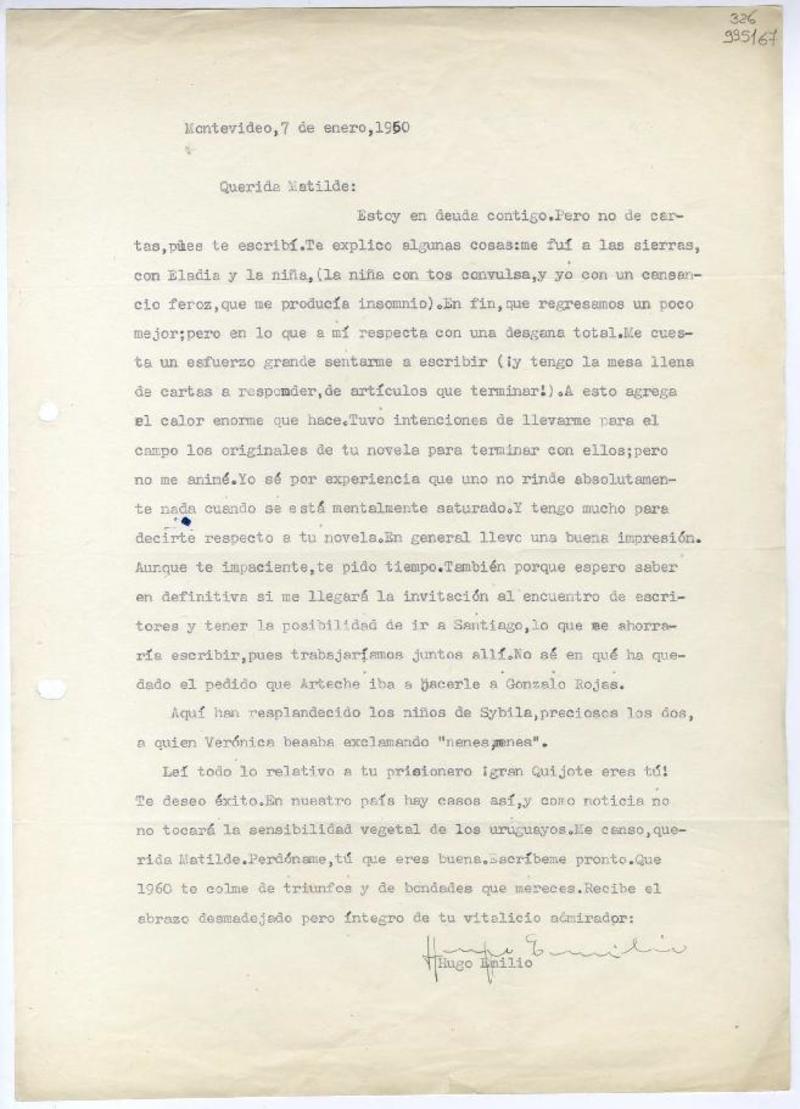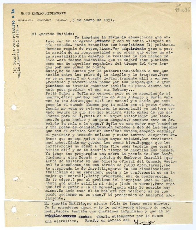 [Carta] 1951 enero 5, Montevideo, Uruguay [a] Mi querida Matilde [manuscrito] Hugo Emilio Pedemonte.